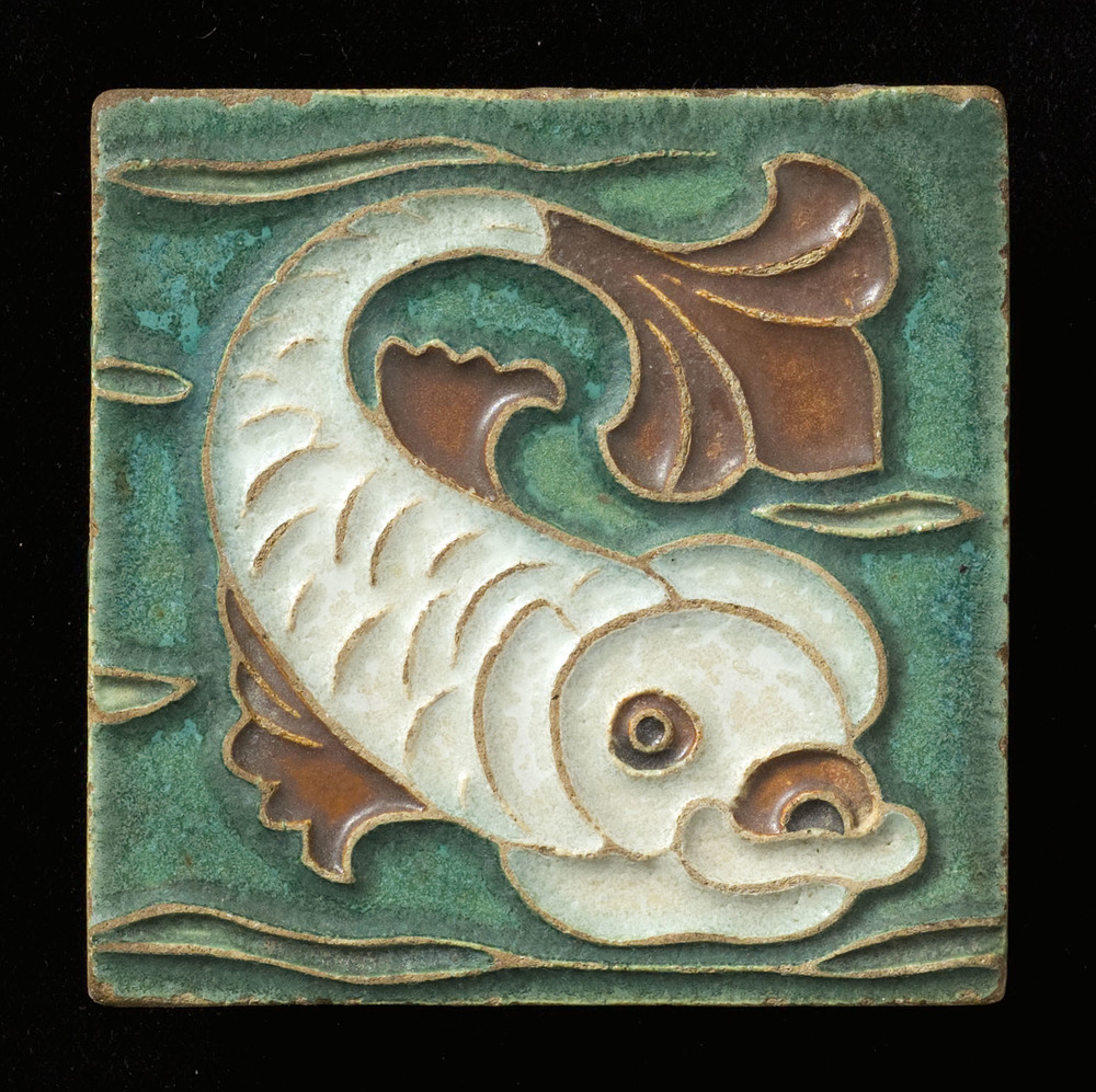 Tegel in cloisonné-techniek, met voorstelling: vis, ...