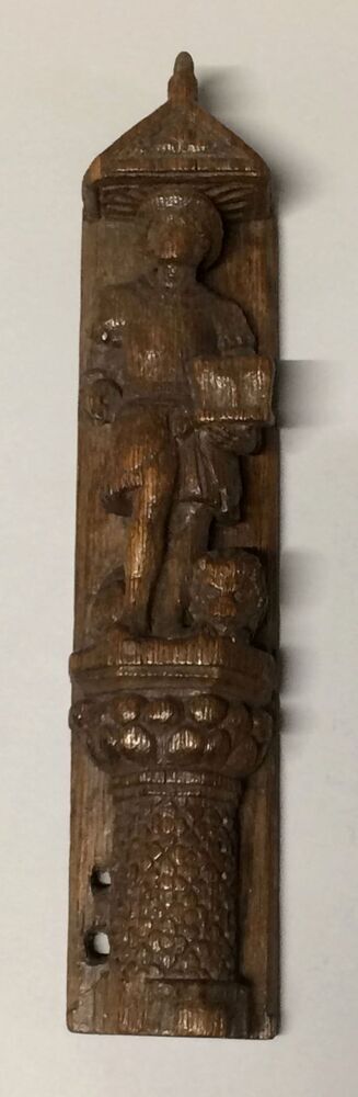 Snijwerk van pilaar met man met kistje