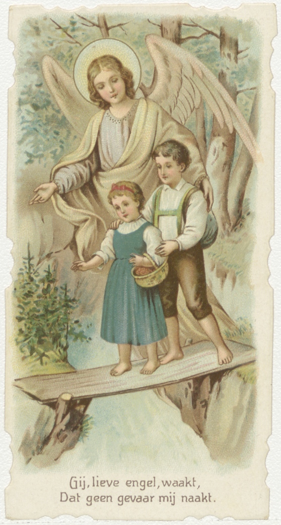 Engelbewaarder met twee kinderen op brug, met "Gij, ...