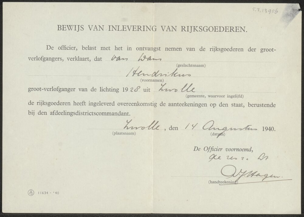 Bewijs van inlevering van Rijksgoederen op naam van ...