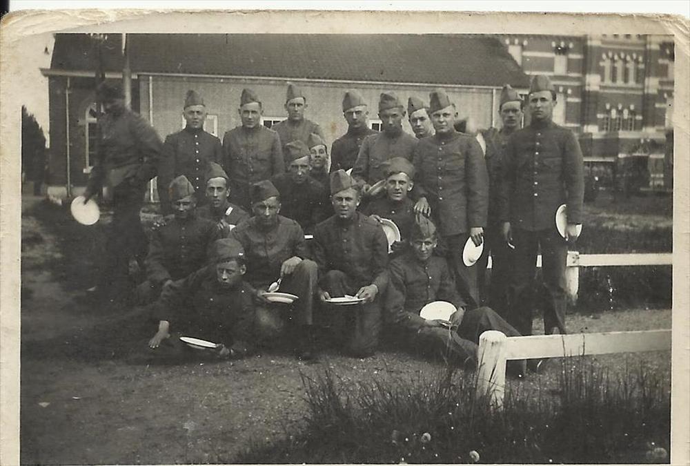 groepsfoto soldaten met borden en bestek