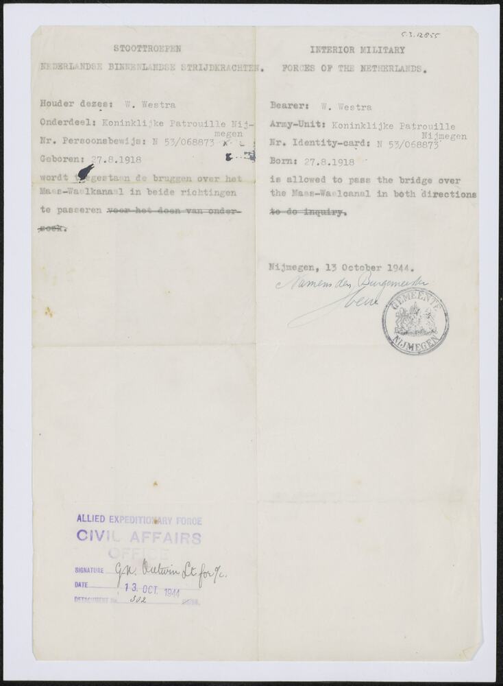Laissez-passer van de Stoottroepen dat W. Westra, li...