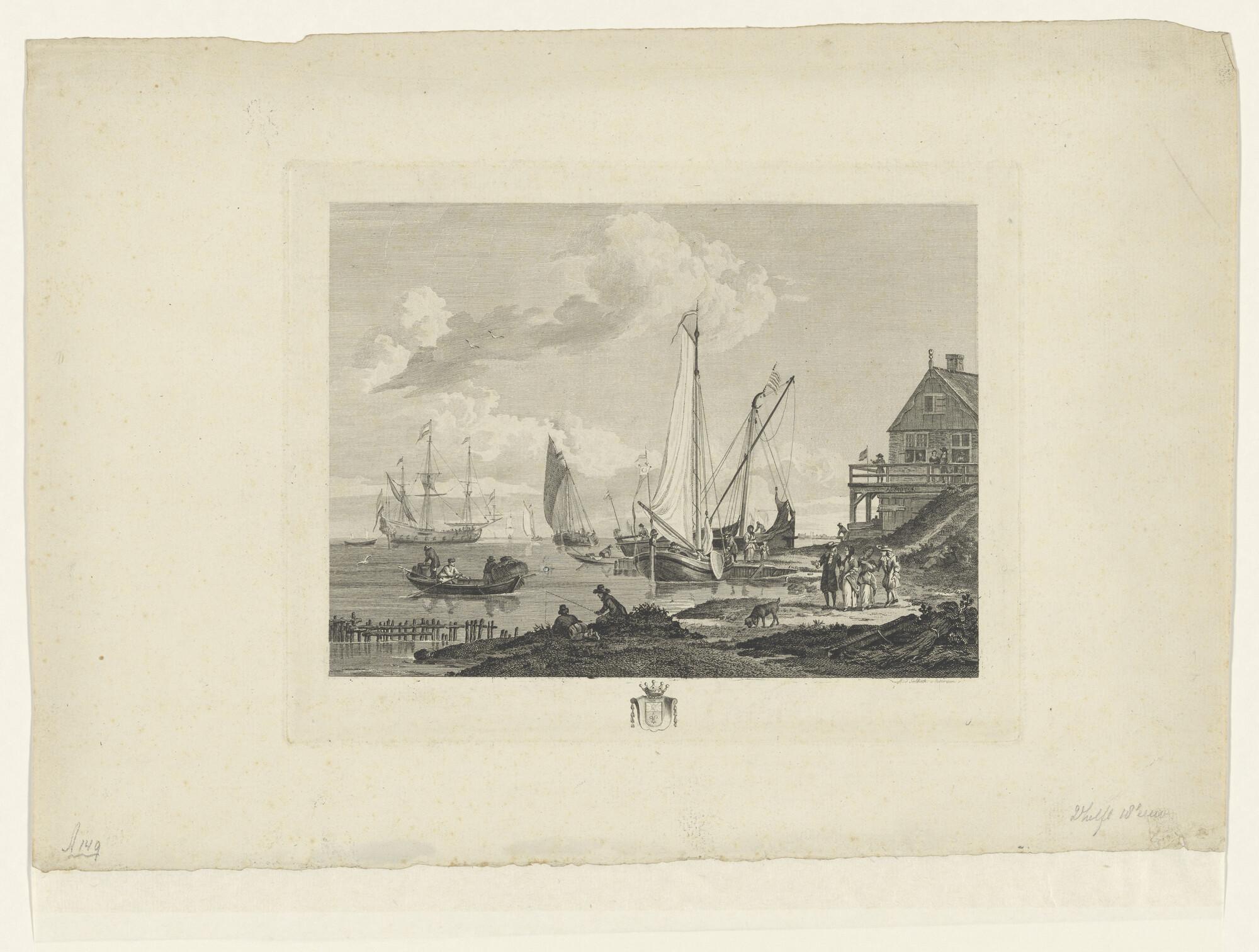 Een havengezicht, met rechts een woonhuis, waarbij e...