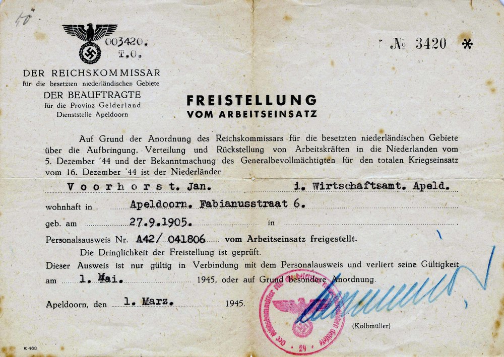 vrijstellingsbewijs arbeidsdienst voor J. Voorhorst,...