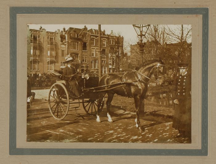 Foto van mevrouw Kramer in rijtuig, met koetsier Koe...