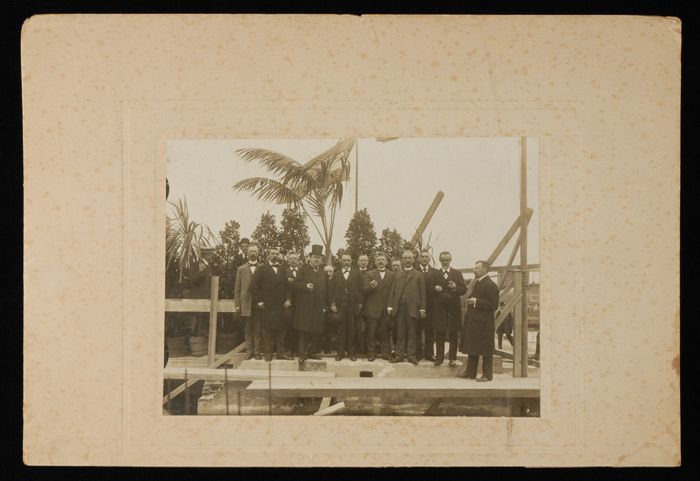 Zwart-wit foto van de eerstesteenlegging van de Berg...