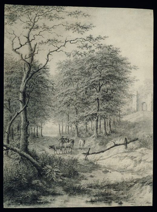 Tekening in potlood, boslandschap met veedrijver en ...