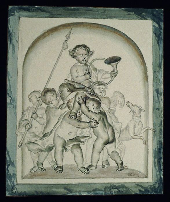 Tekening, grisaille, jachtgezelschap van putti in ee...