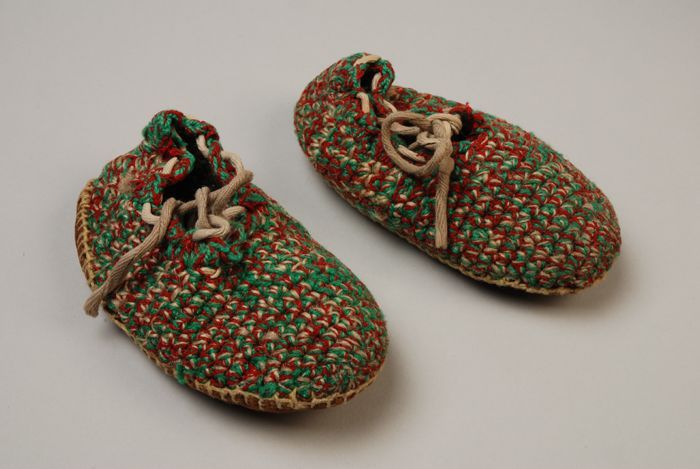 Gehaakte kinderslofjes van rode, groene en witte garens