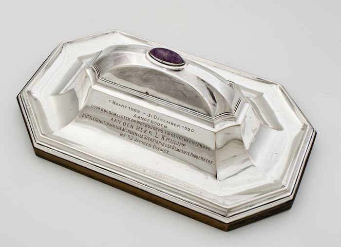 Zilveren inktstel op houten voet en met paars amethi...
