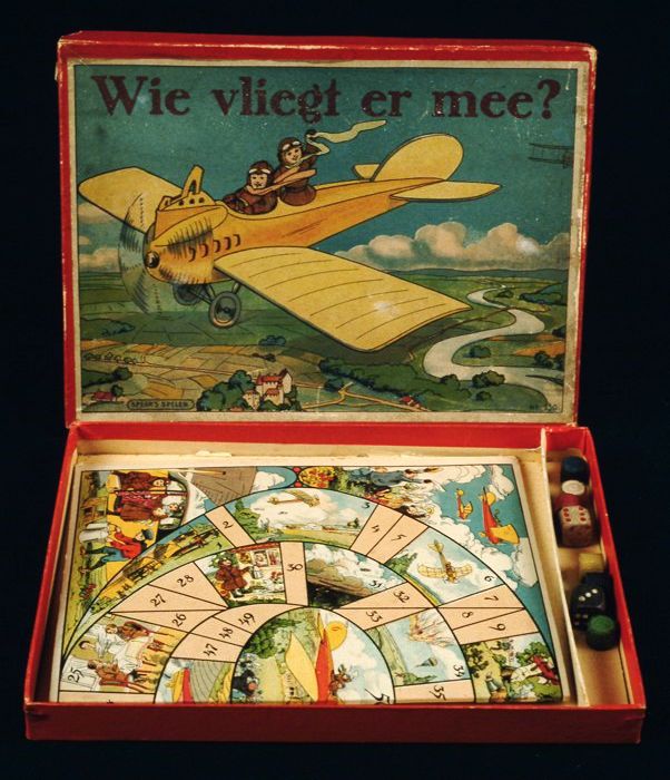 Spel "Wie vliegt er mee?" in rode doos: speelbord, t...