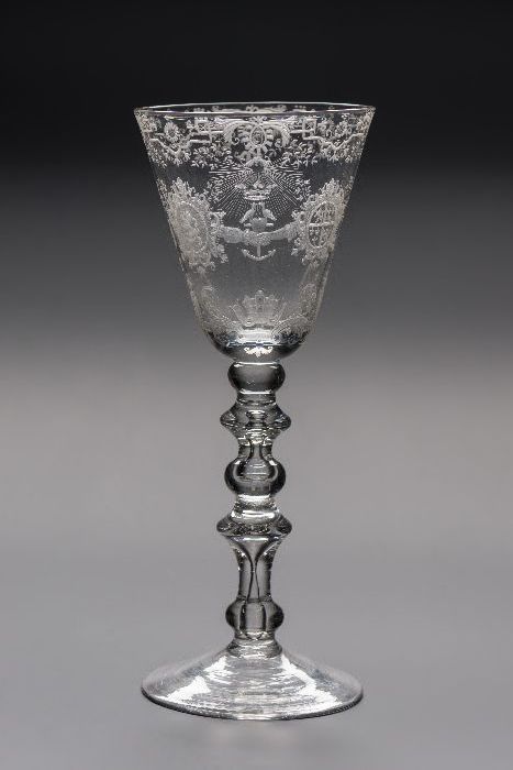 Kelkglas gegraveerd met huwelijkssymbolen en familie...