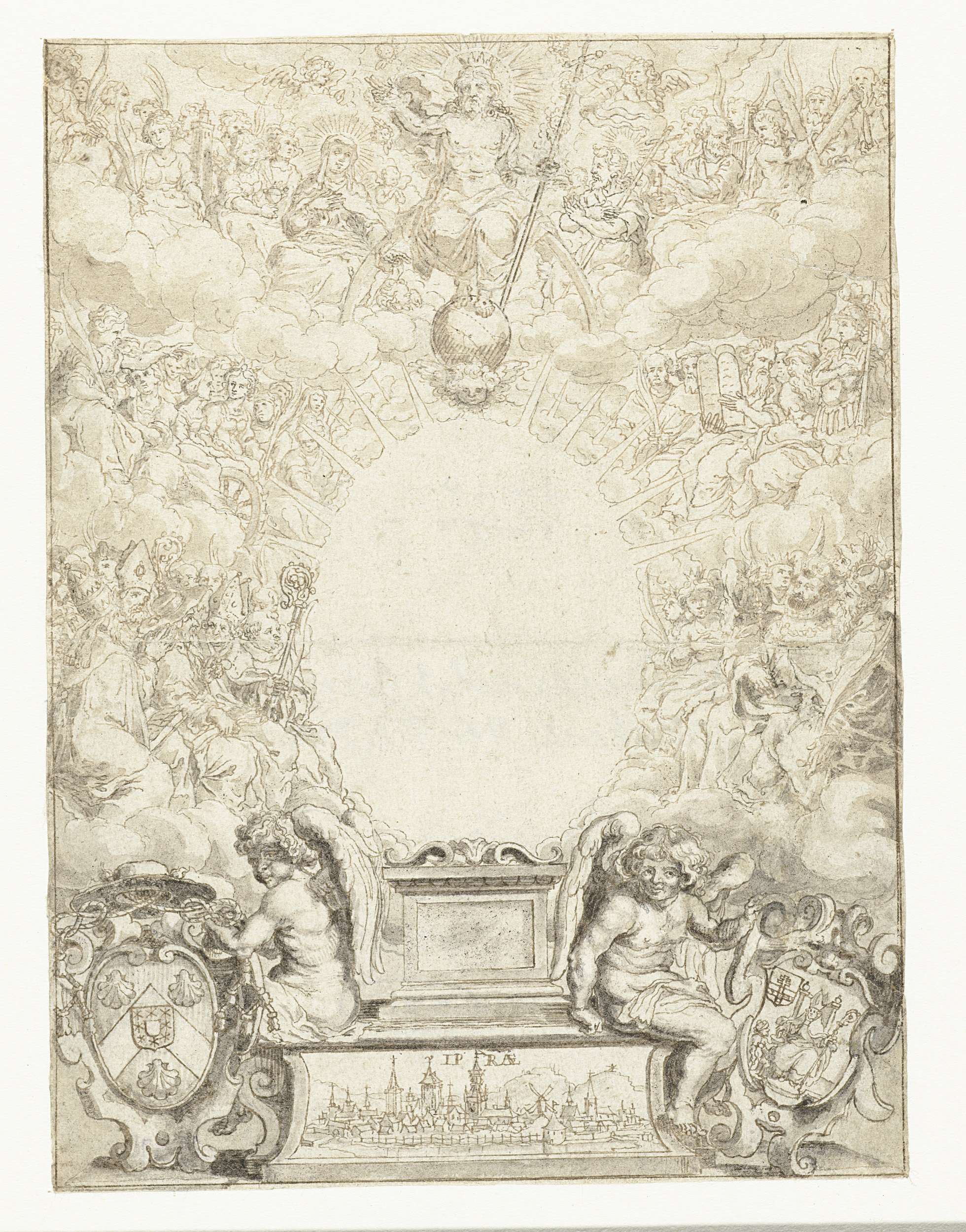 Ontwerp voor titelblad met Christus omringd door fig...