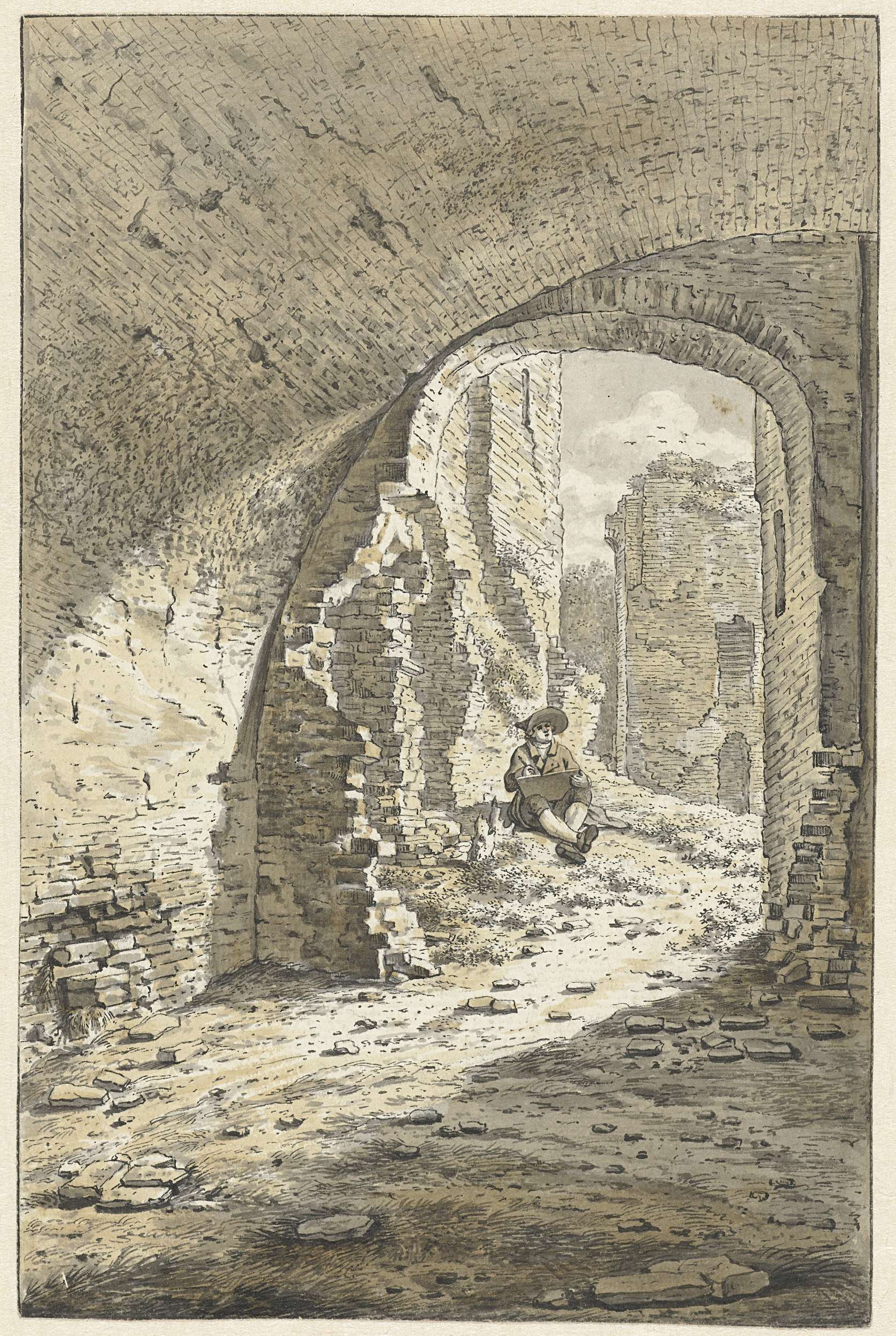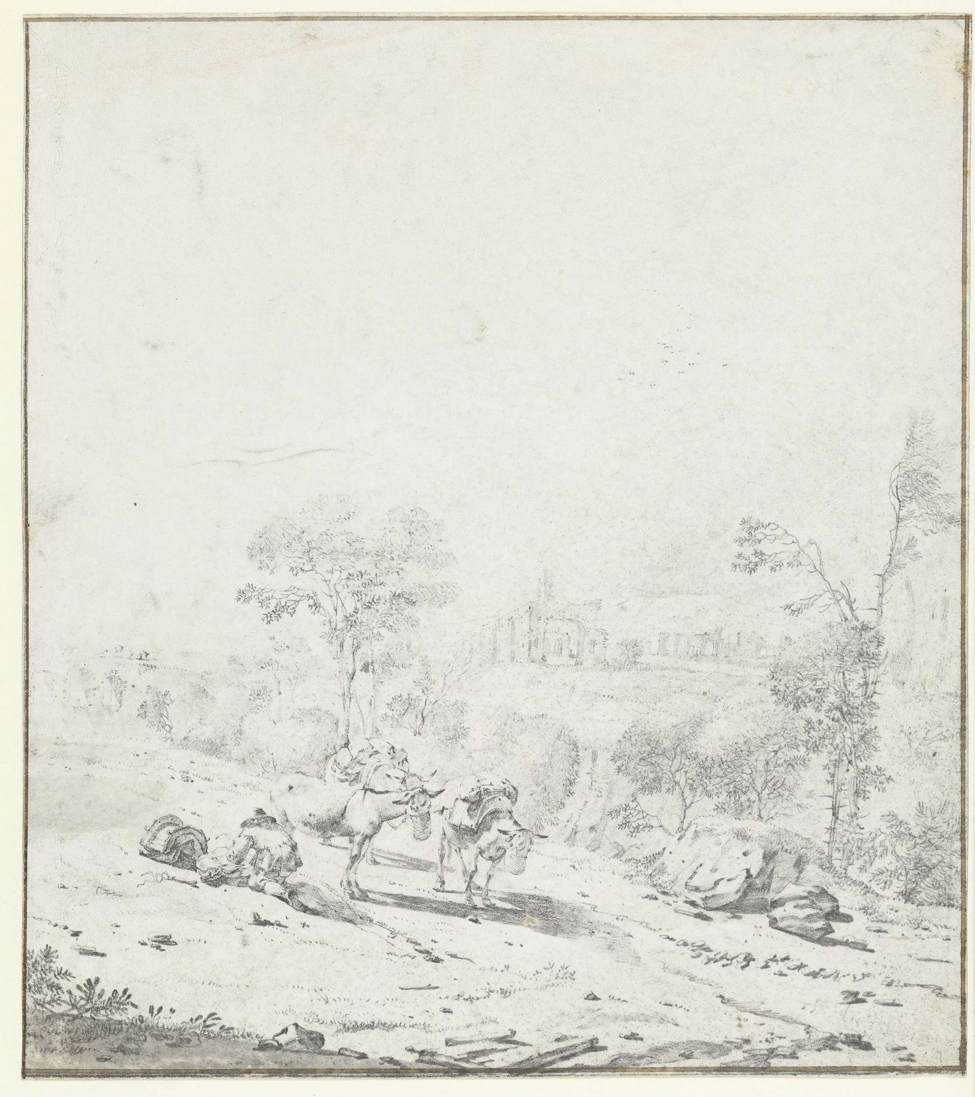 Italiaans landschap met rustende reiziger met ezels