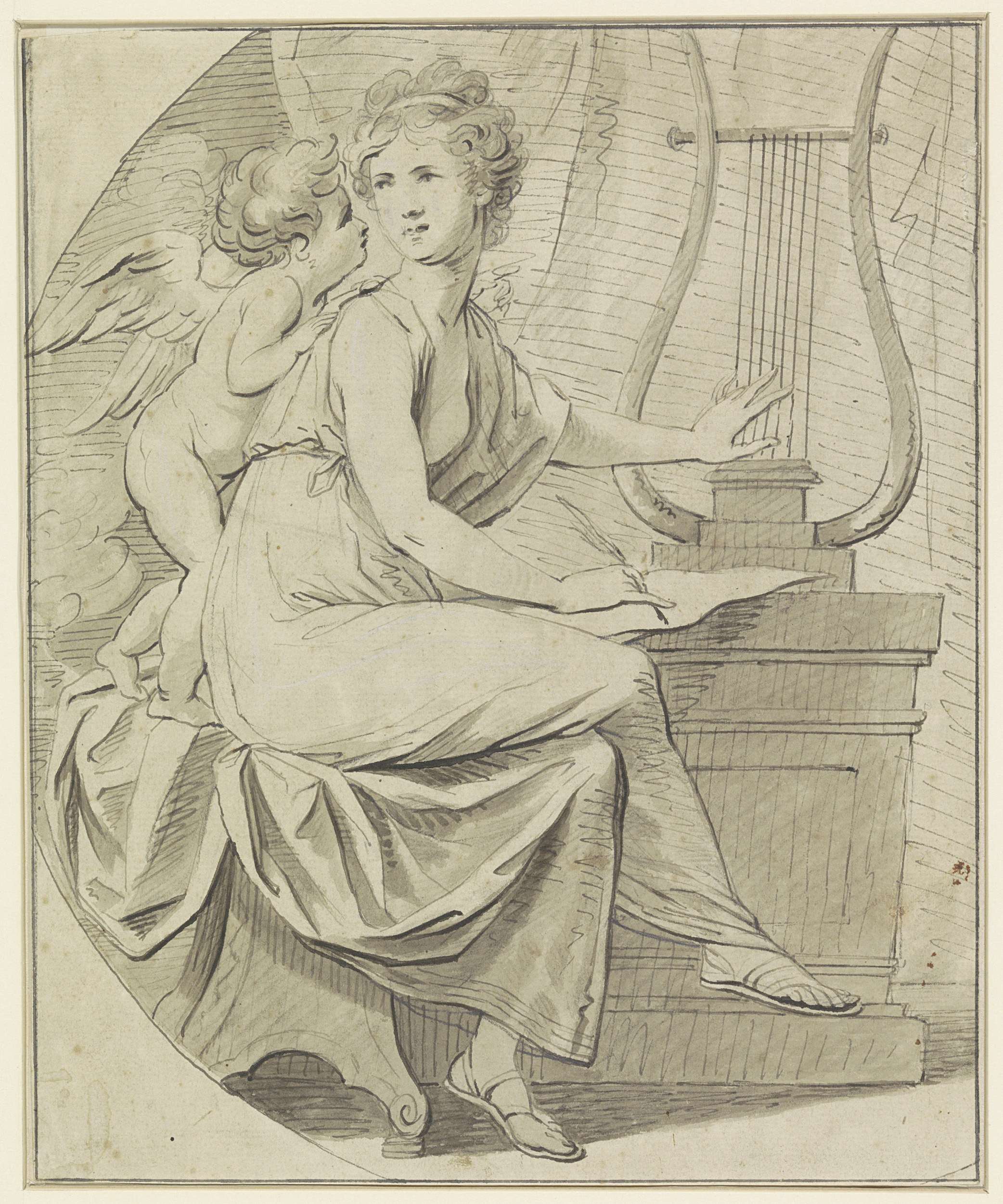 Amor inspireert een jonge vrouw, die met de ene hand...