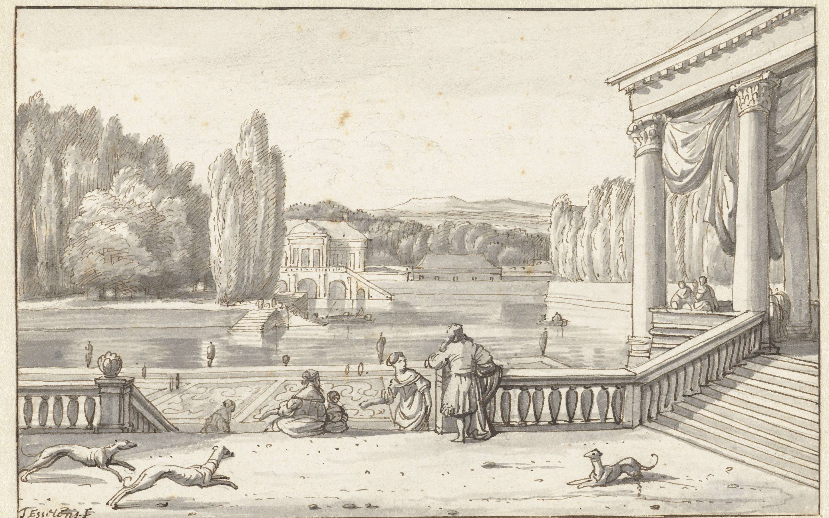 Parkgezicht met figuren en honden op een terras