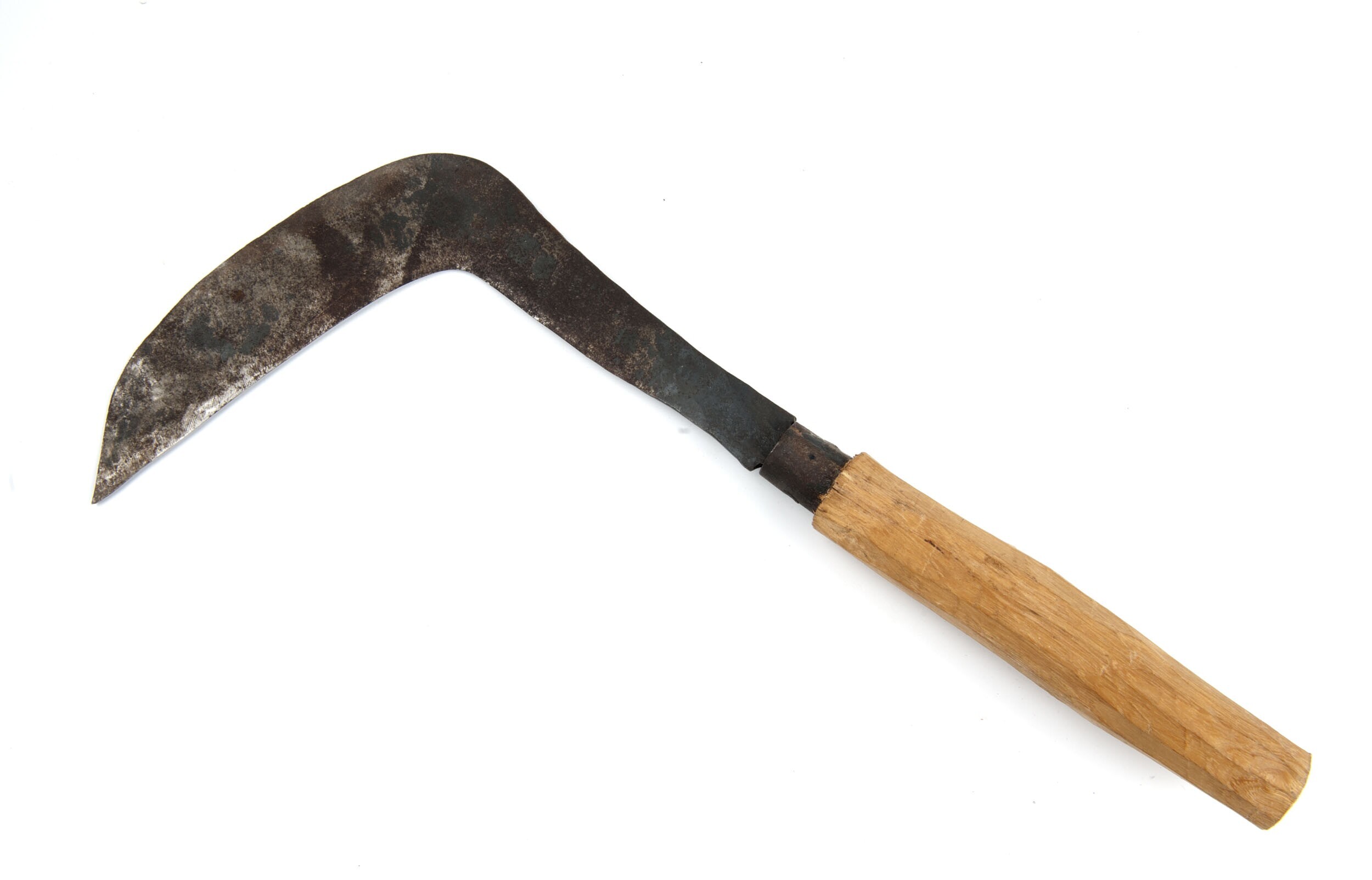 Metalen sikkel met houten handvat