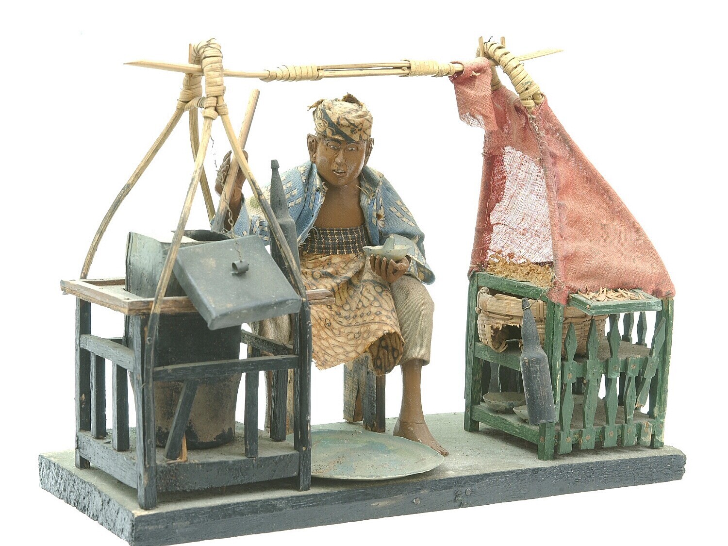 Model van een bamiverkoper met een draagbare gaarkeu...