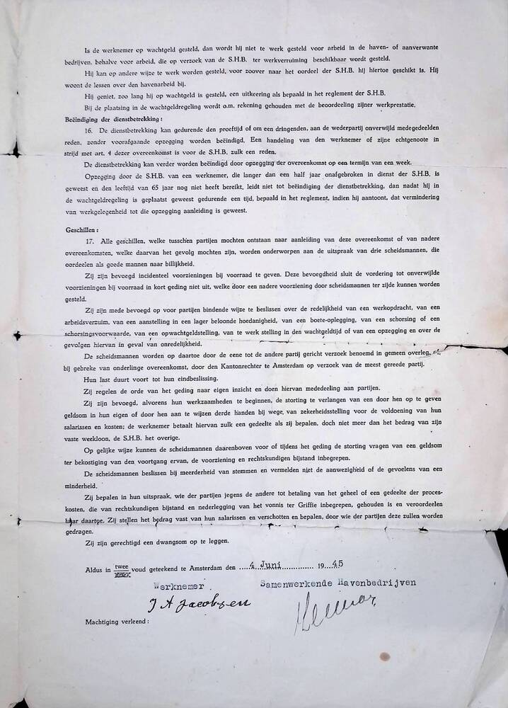Arbeidsovereenkomst, J.A. Jacobsen, 4 juni 1945