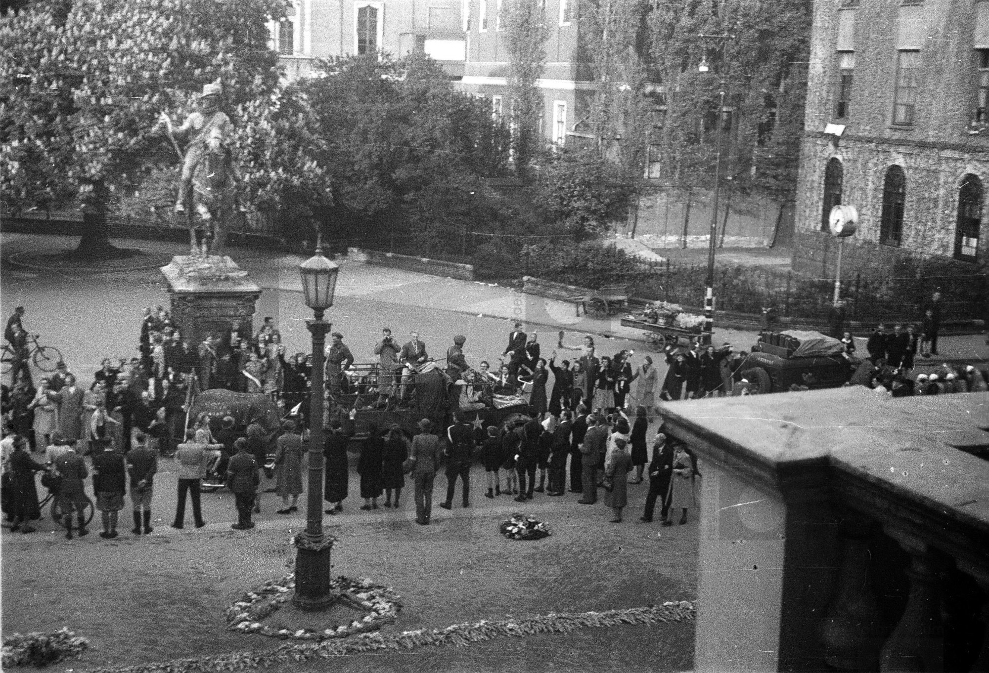 Geallieerde voertuigen rijden tijdens hun intocht vo...