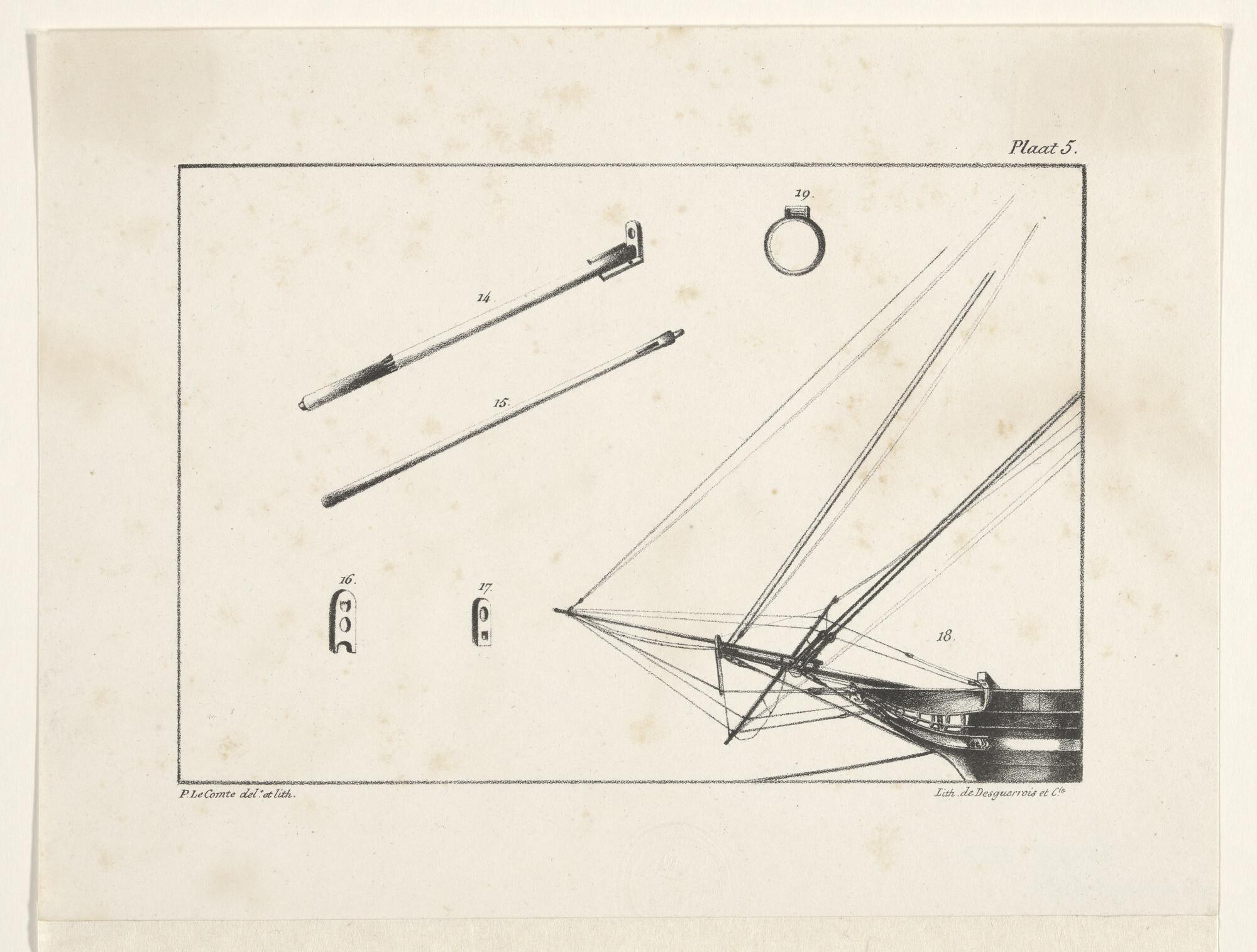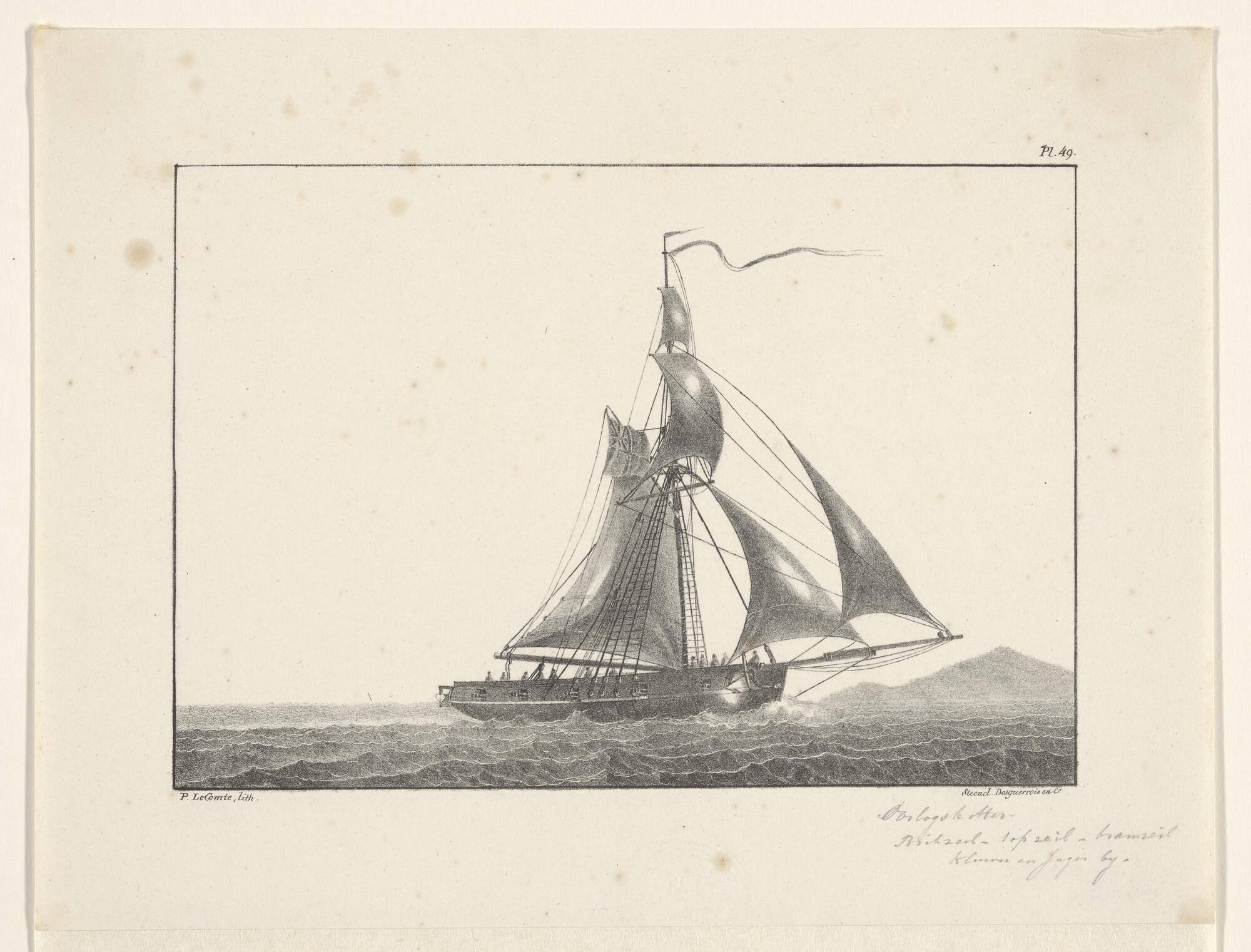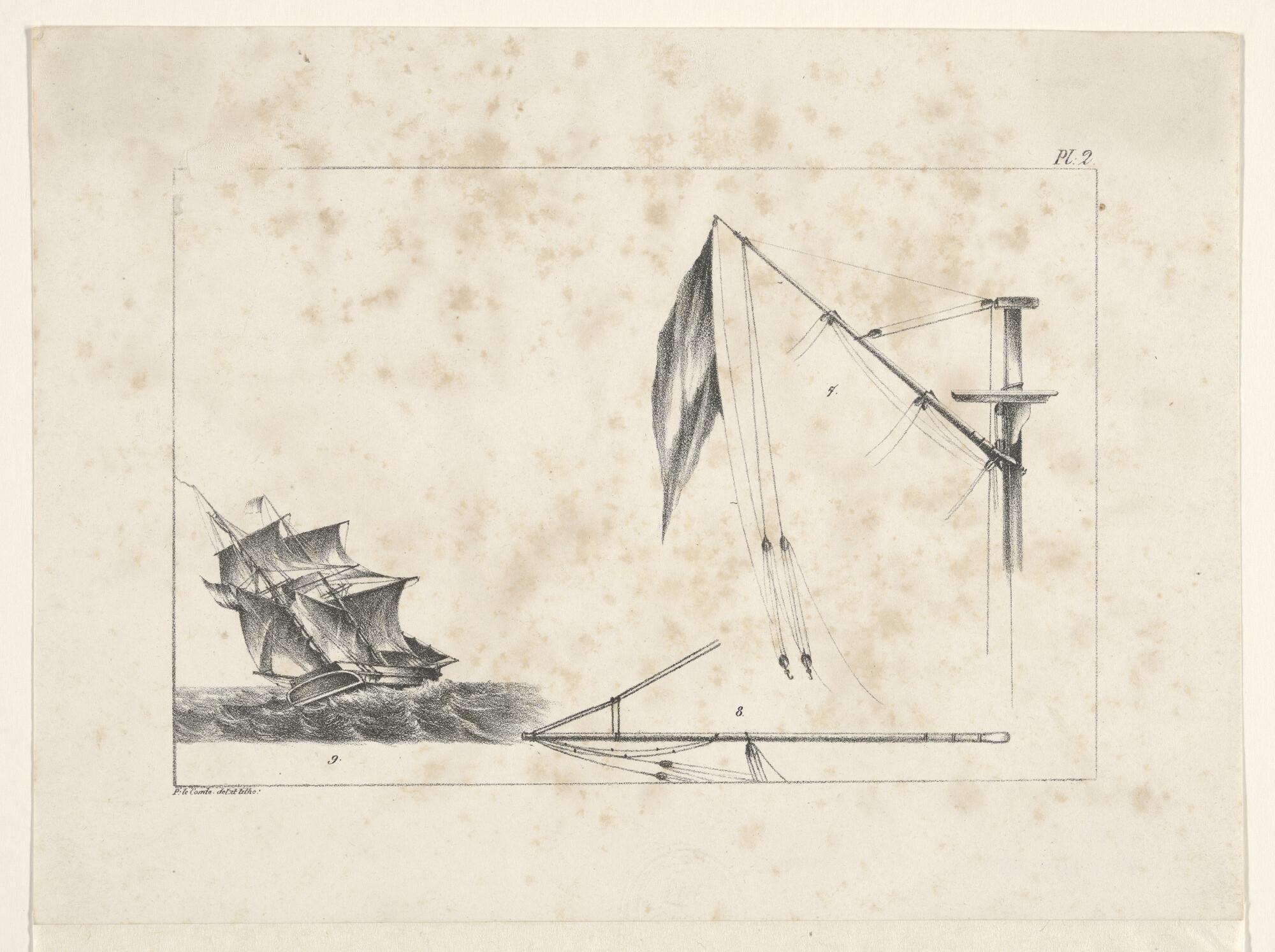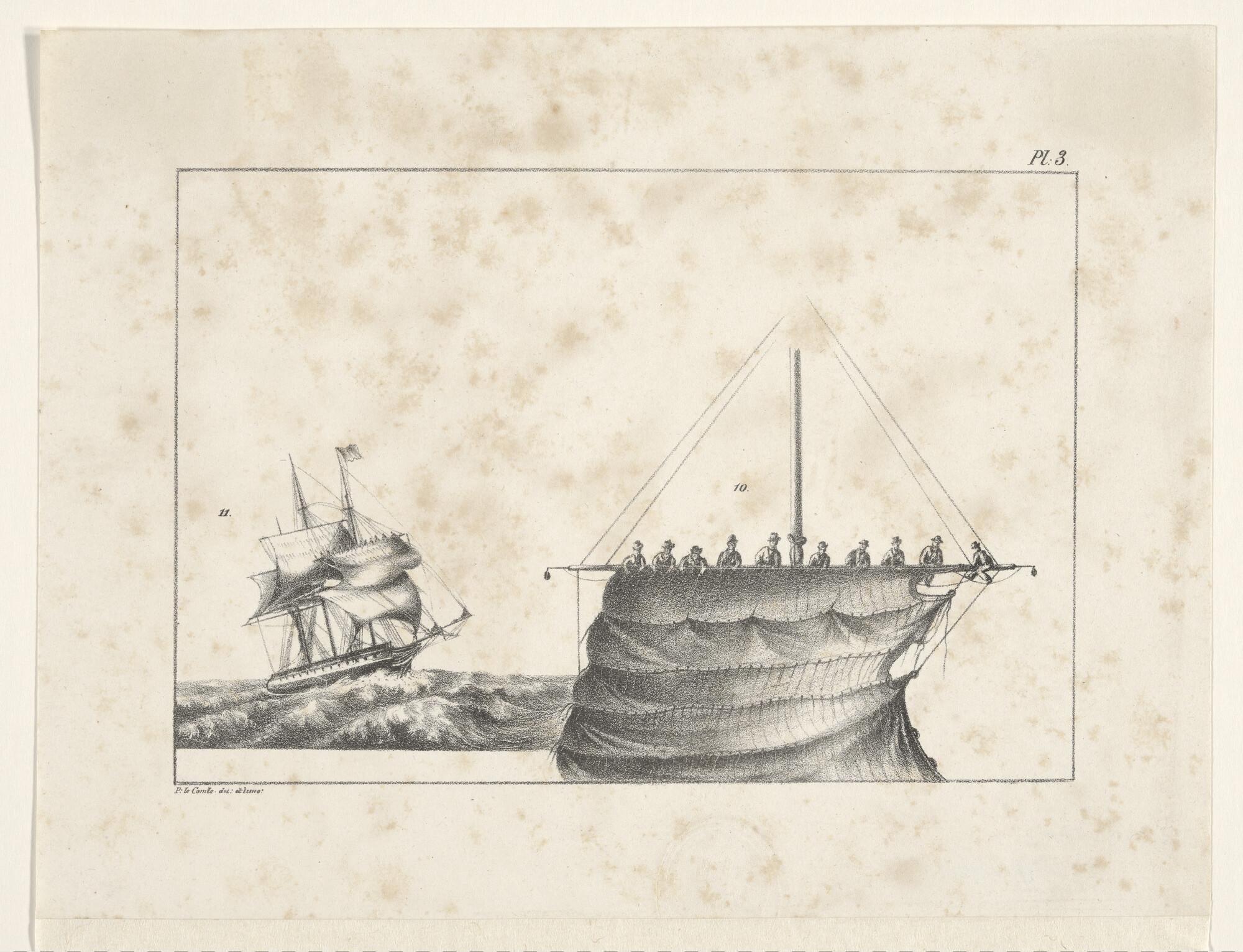 Prent van een marszeil met uitgeënterd volk op de Ra