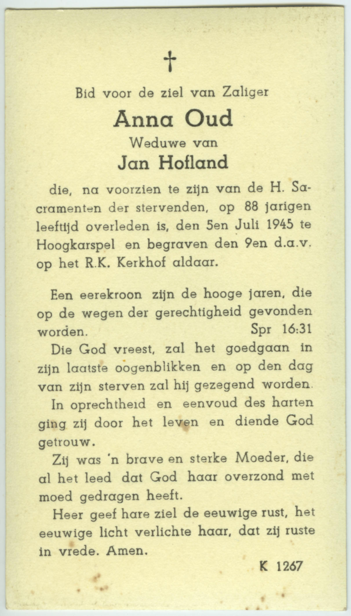 Bidprentje van Anna Oud, 1945 (bidprentje)