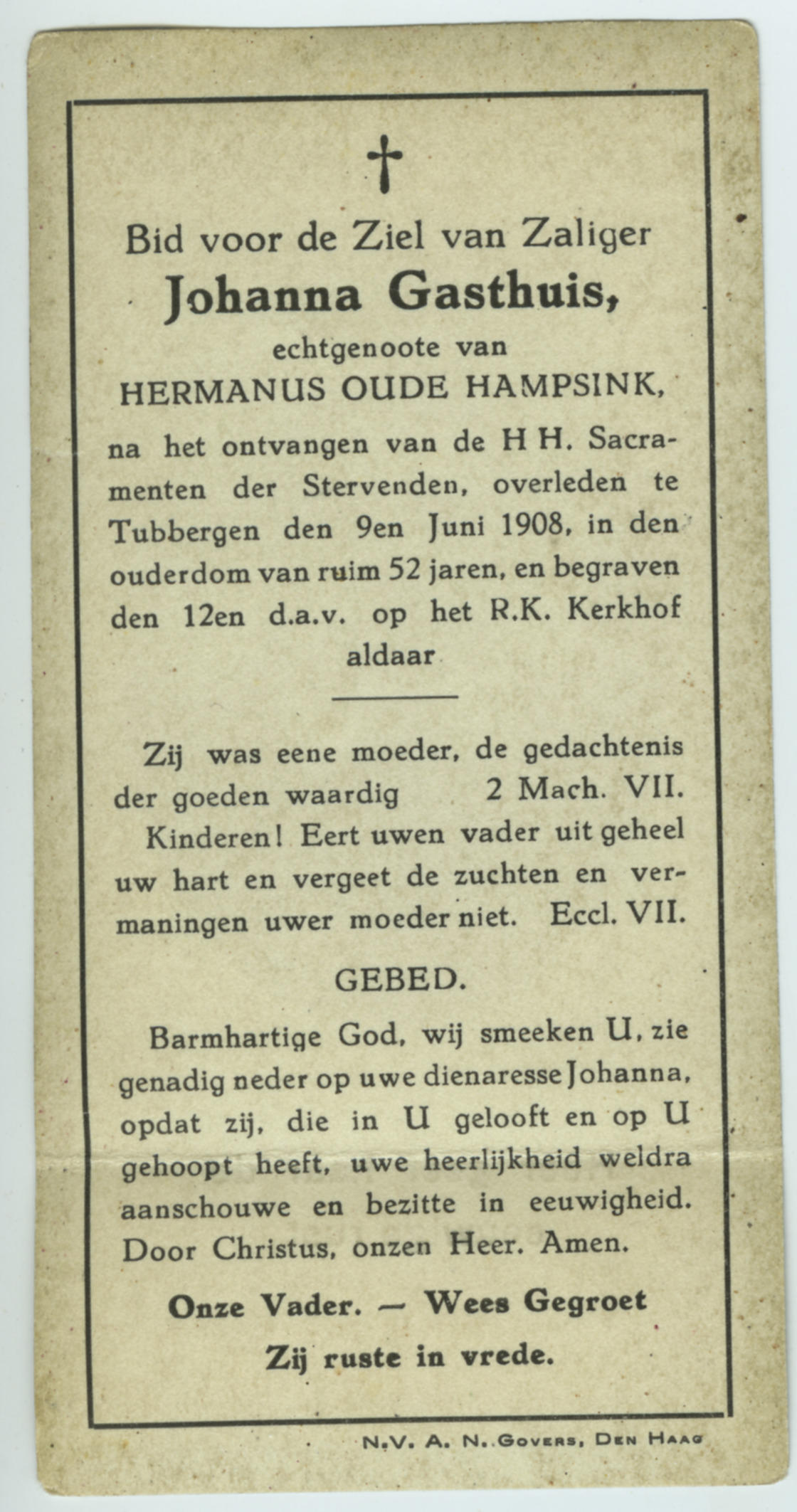 Bidprentje van Johanna Gasthuis, 1908 (bidprentje)
