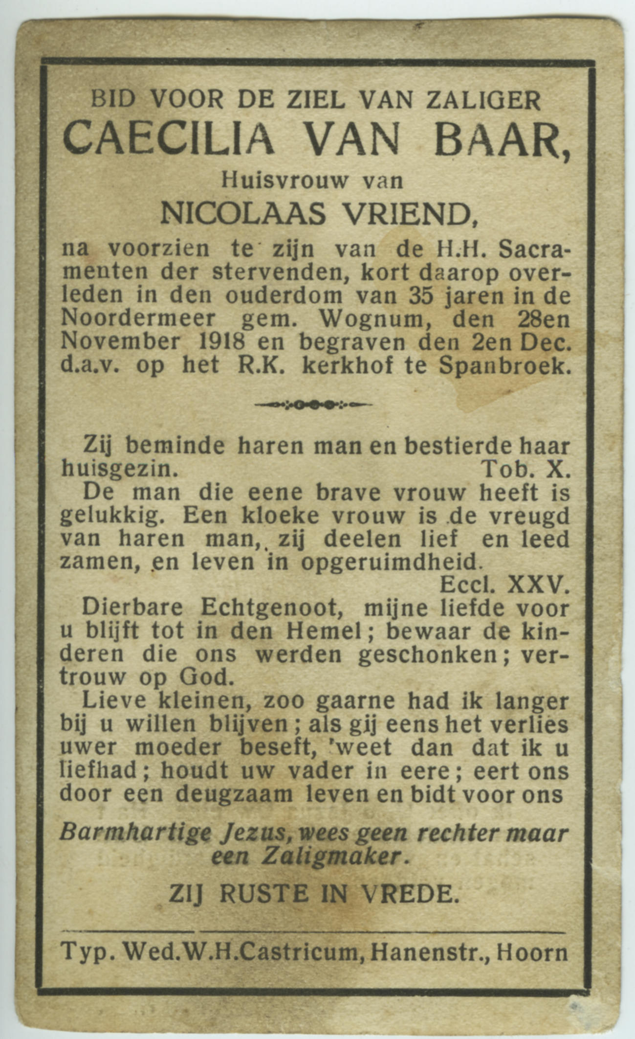 Bidprentje van Caecilia van Baar, 1918 (bidprentje)