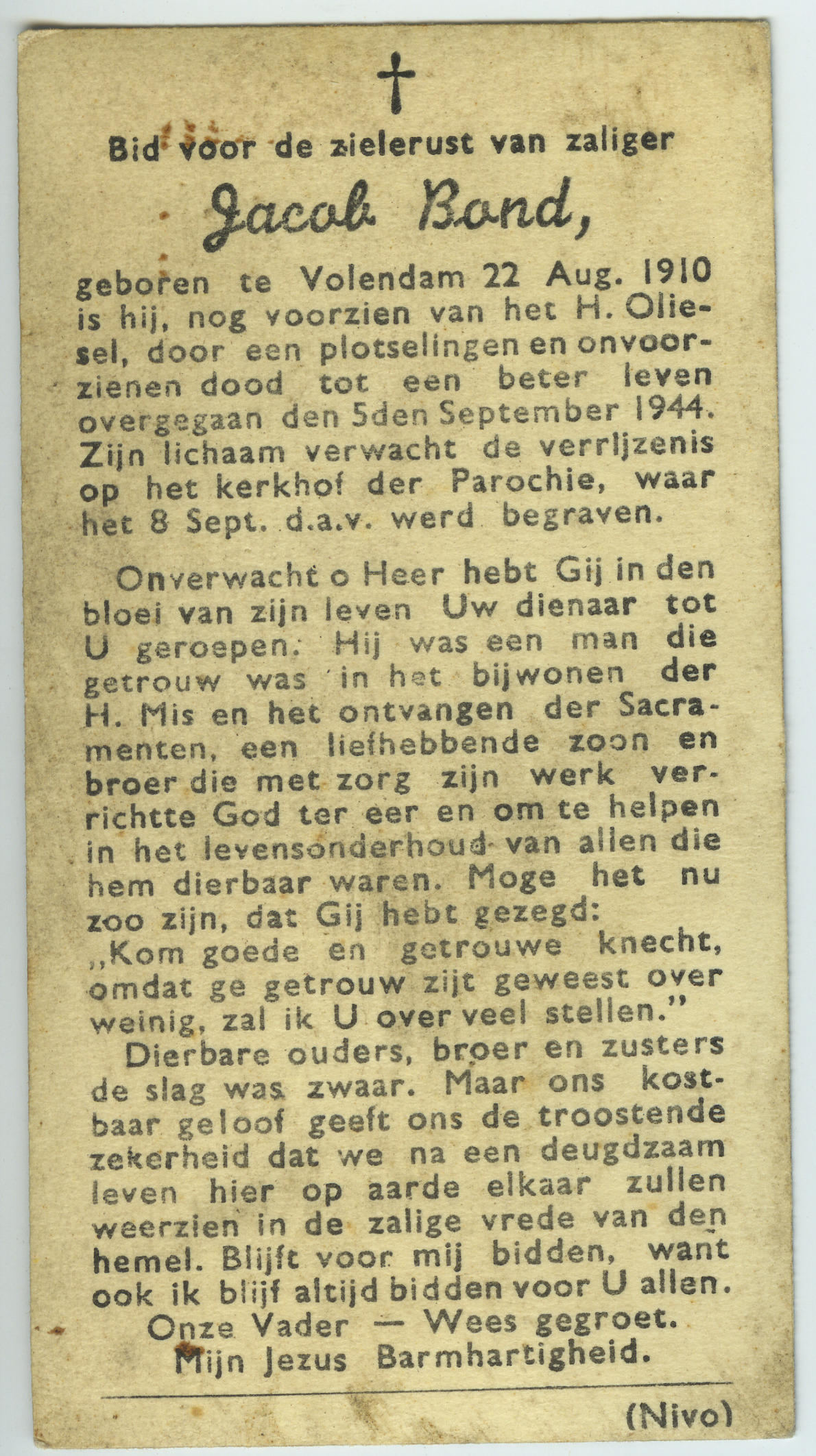 Bidprentje van Jacob Bond, 1944 (bidprentje)