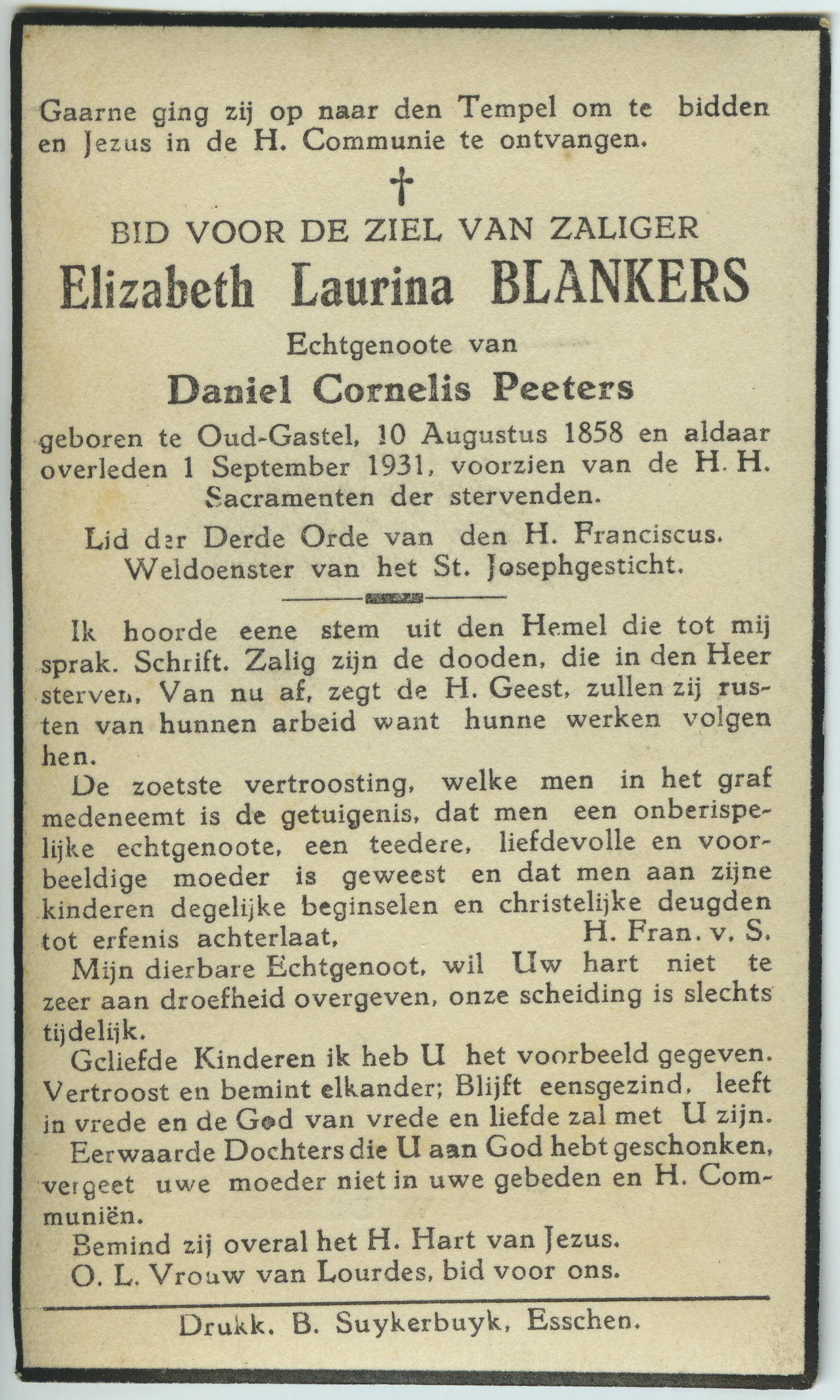 Bidprentje van Elizabeth Laurina Blankers, 1931 (bid...