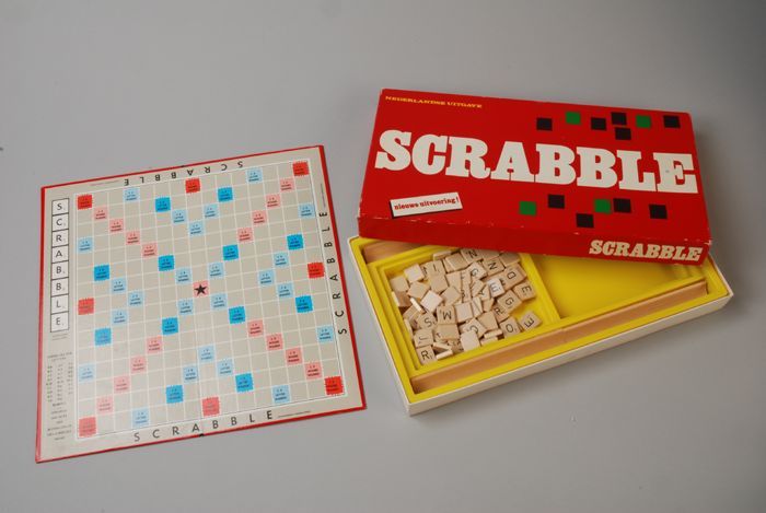 Spel scrabble in rode doos: speelbord en vier houders