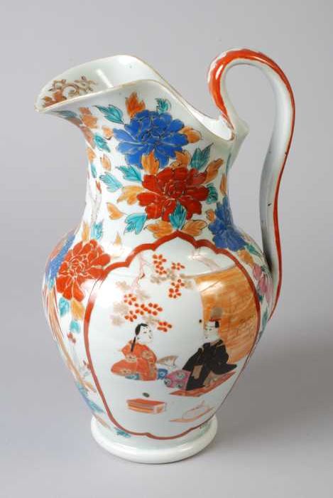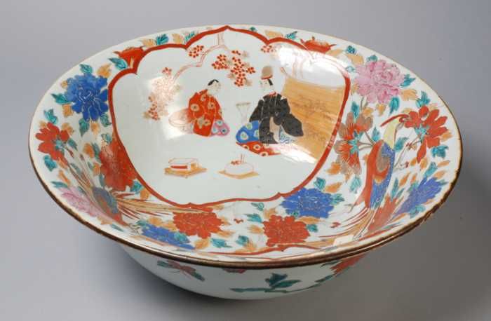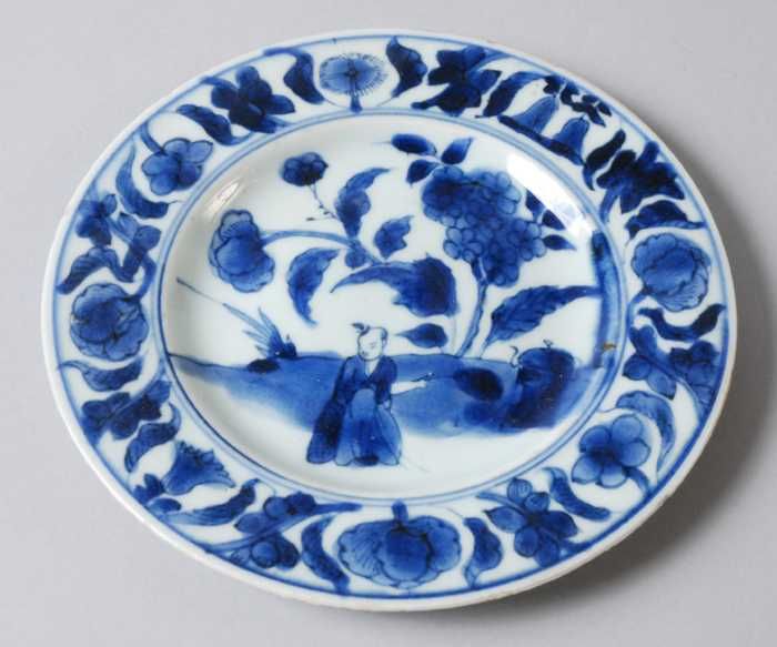 Witte schotel met in blauw Aziatisch figuur en bloemen