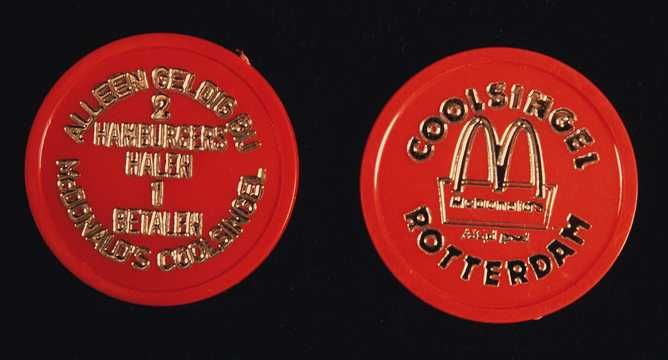 Twee rode plastic muntjes met gouden opschrift, "2 h...