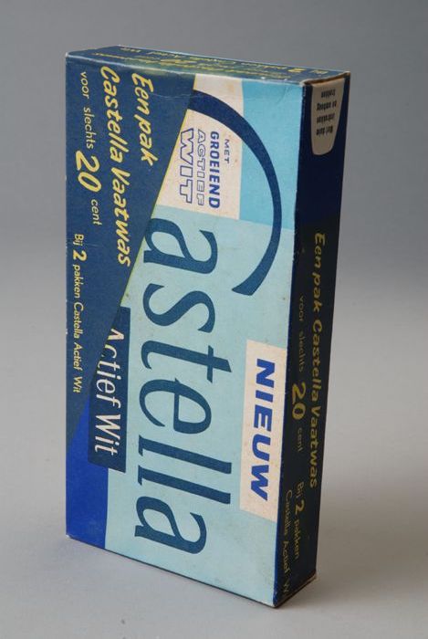 In papier verpakte "Co-op, huishoudzeep", wit en blauw