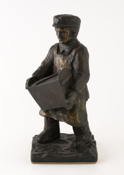 Bronzen beeld van vuilnisman met vuilnisvat in de ha...