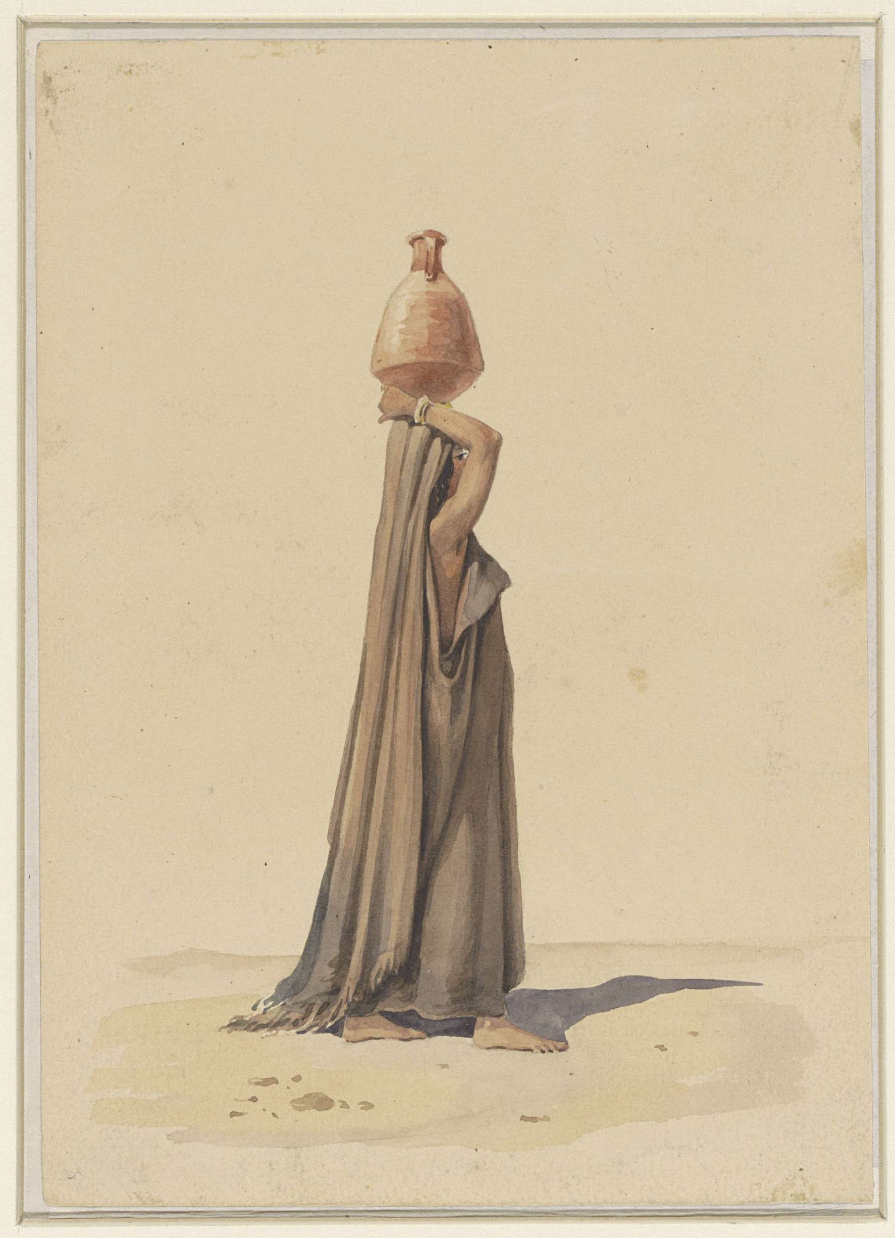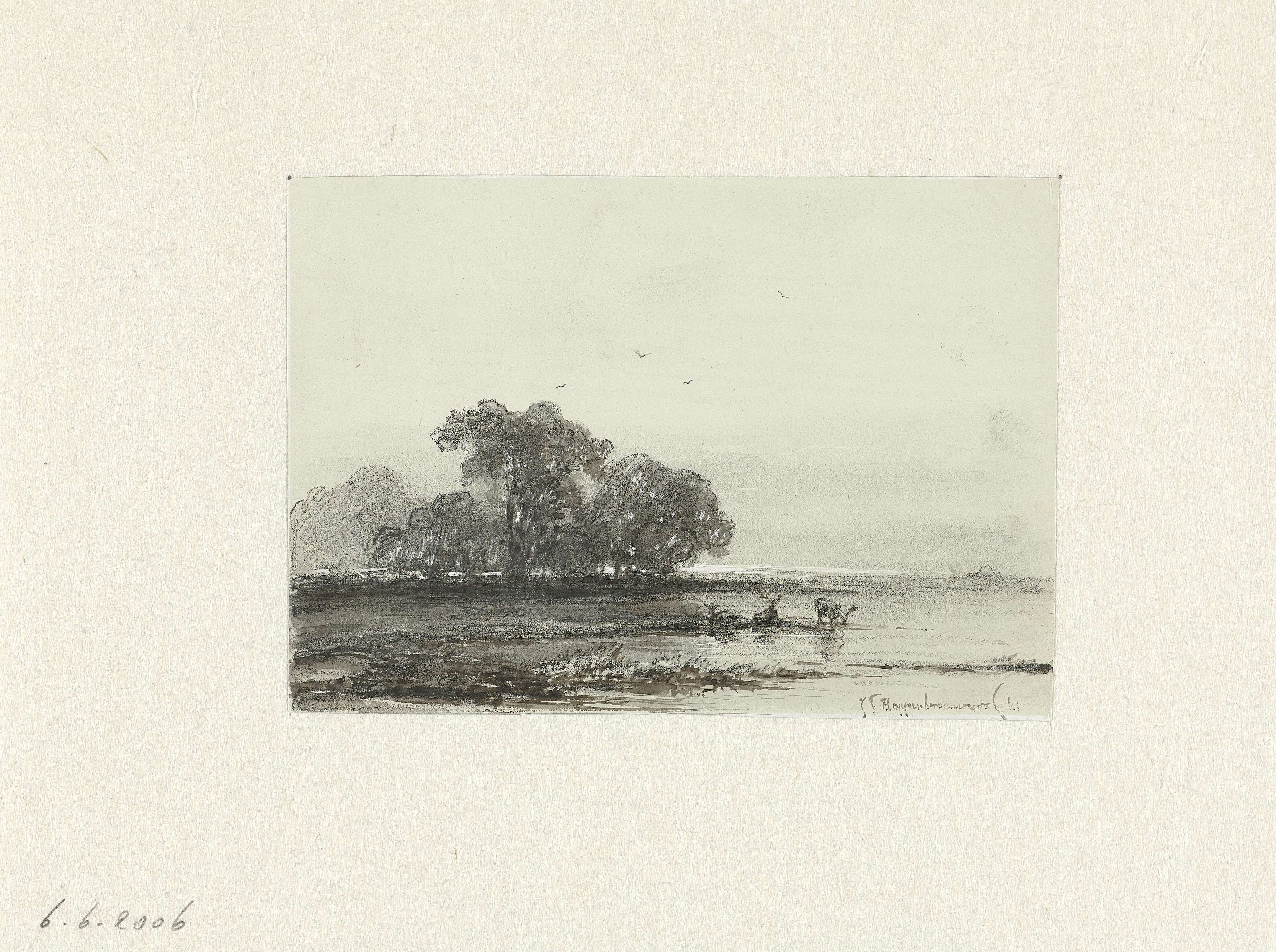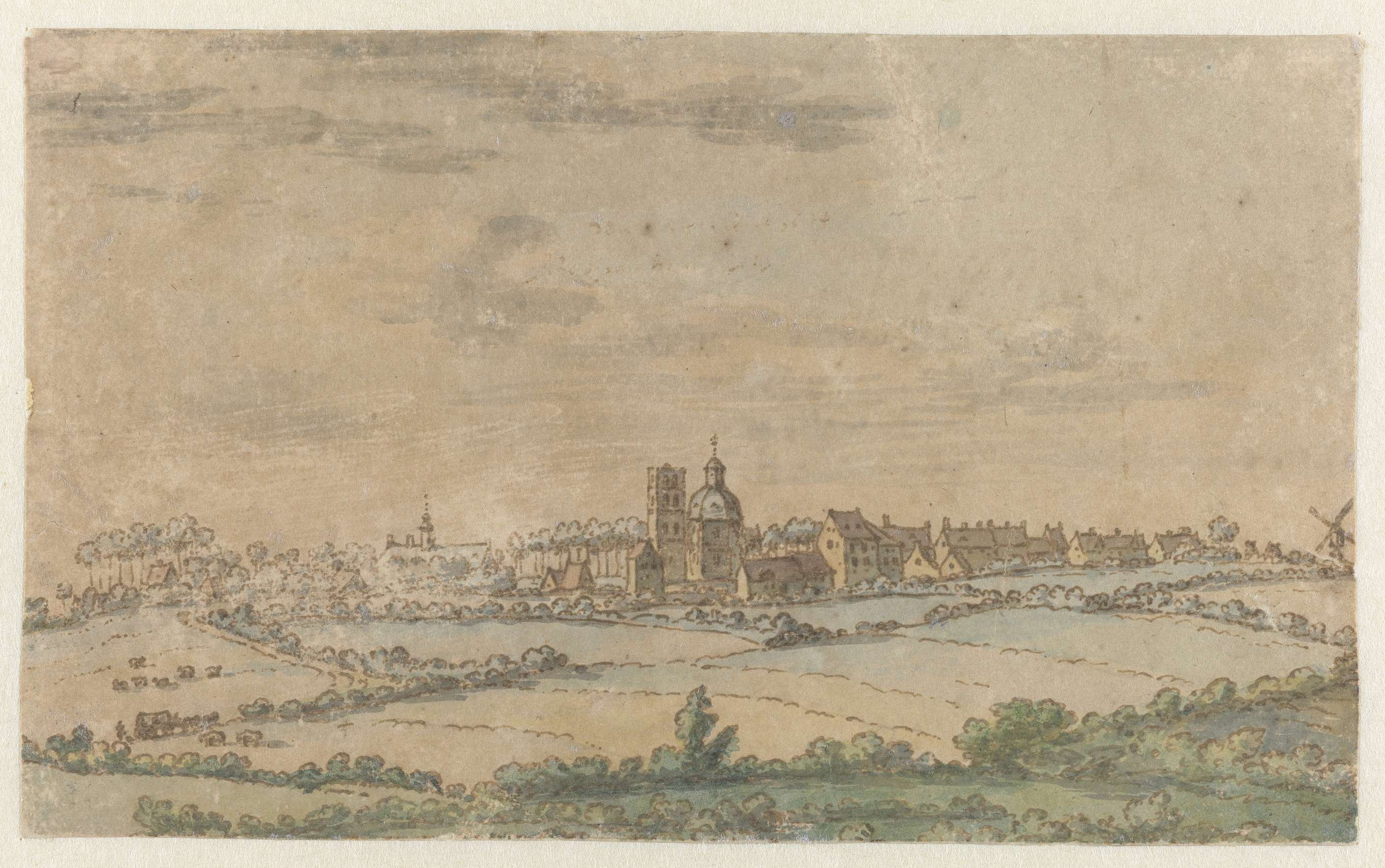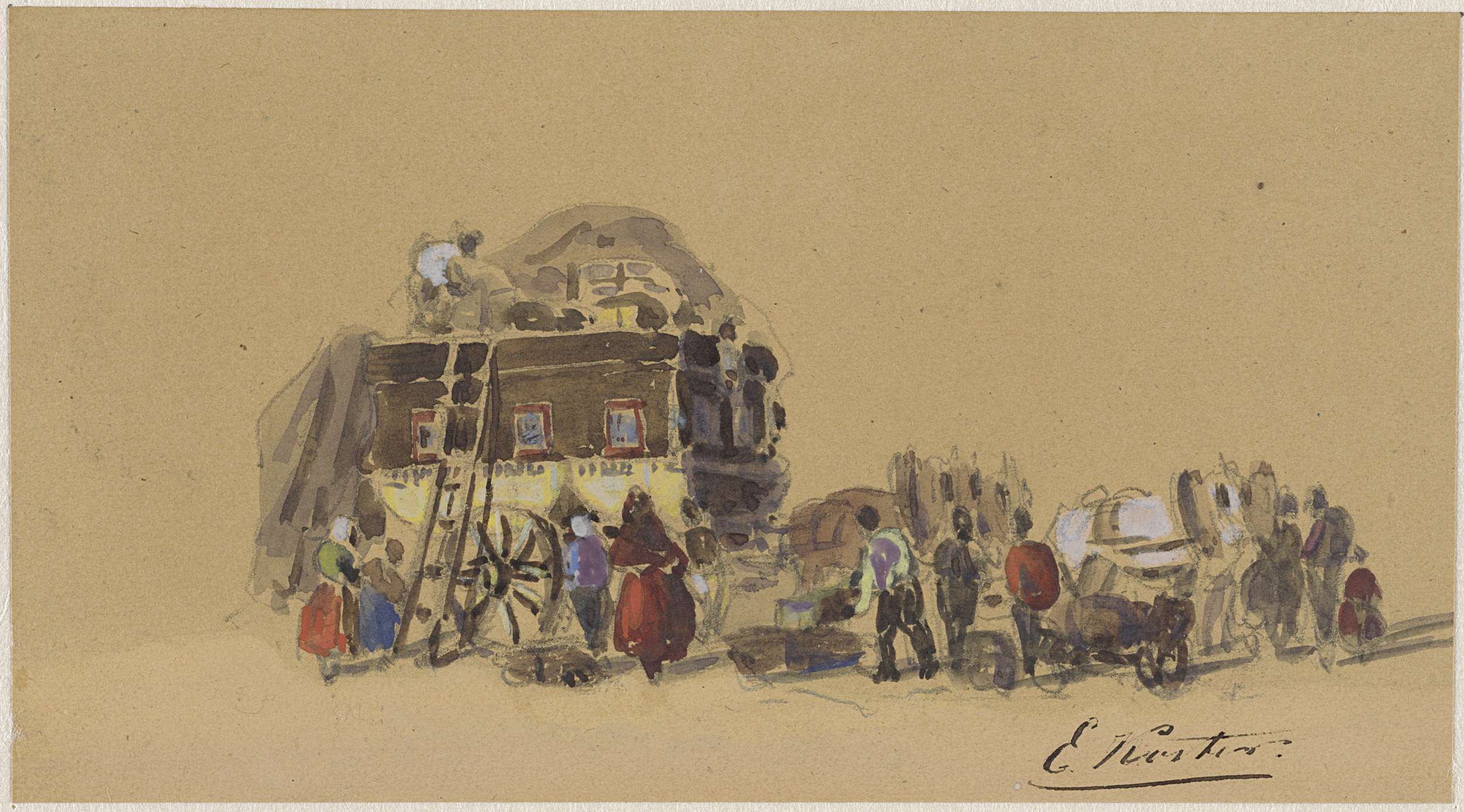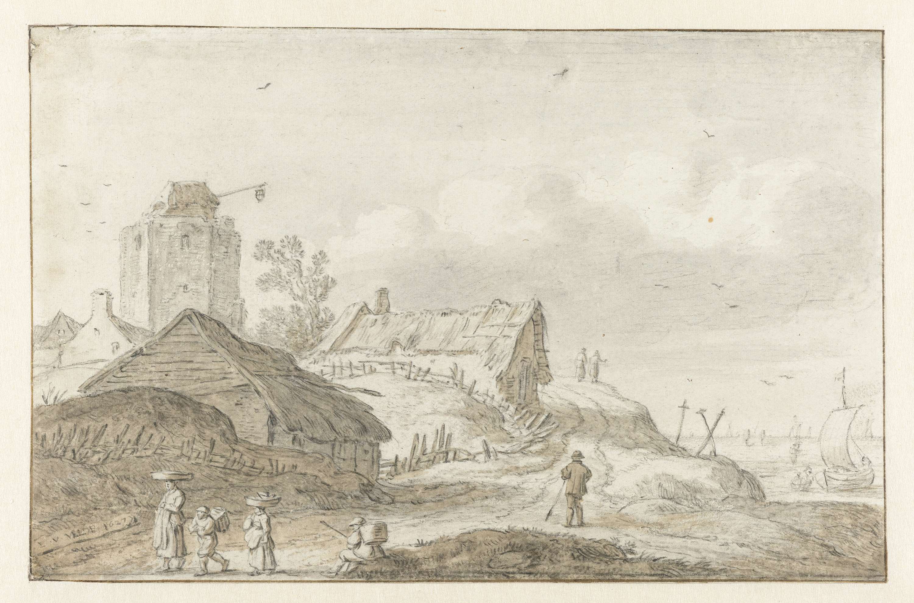 Rivierlandschap met schetsende tekenaar tussen hutjes