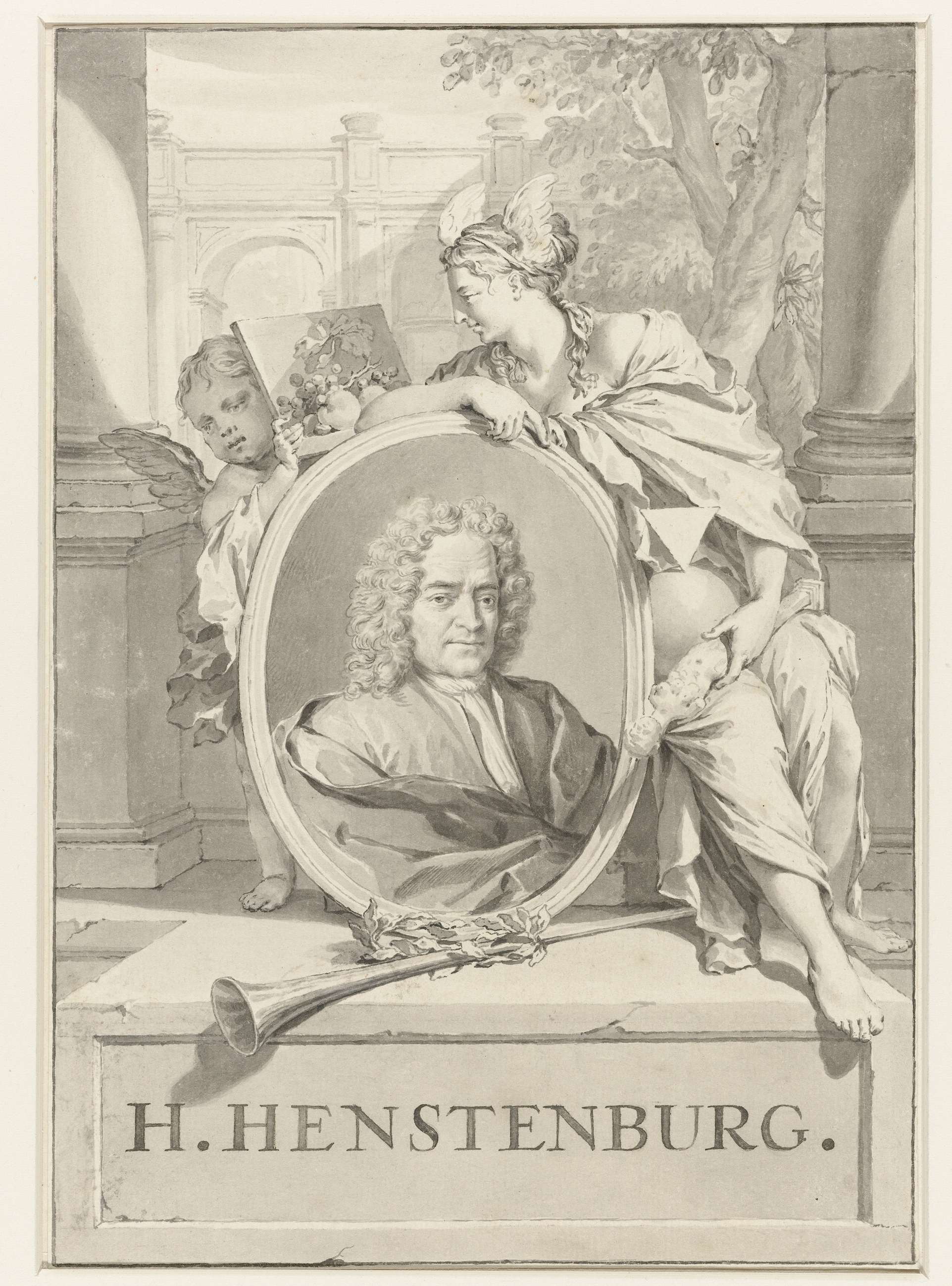 Monument met een vaas met bloemen, een guirlande en ...