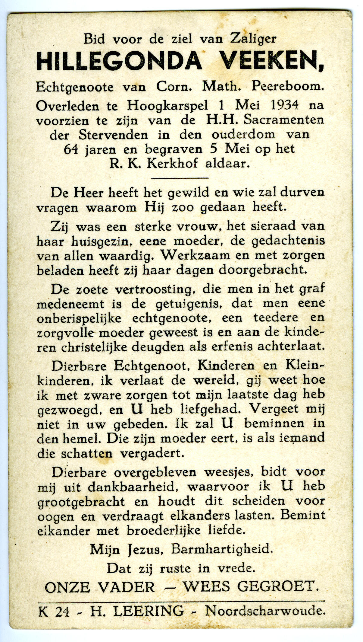 Bidprentje van Hillegonda Veeken, 1934 (bidprentje)