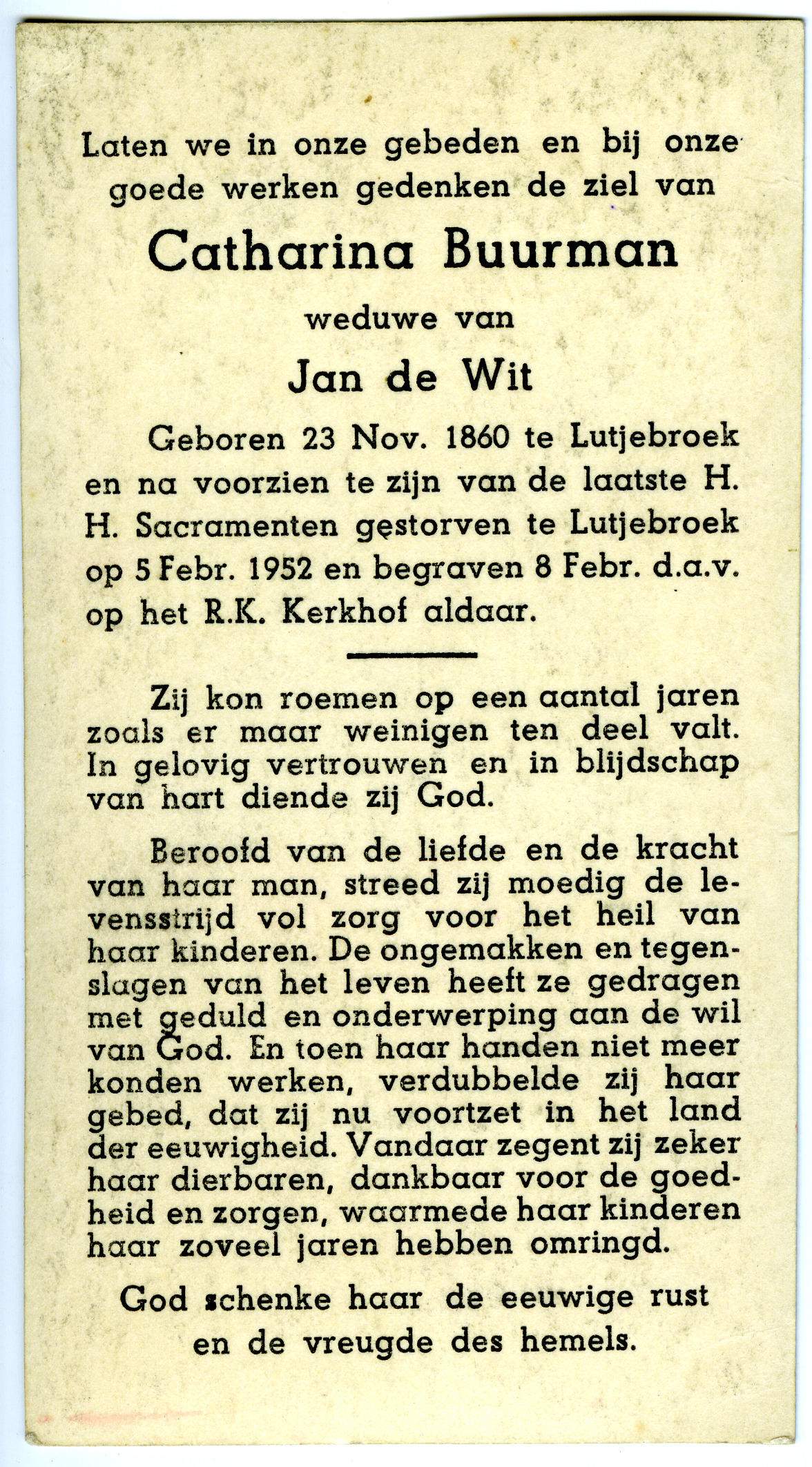 Bidprentje van Catharina Buurman, 1952 (bidprentje)