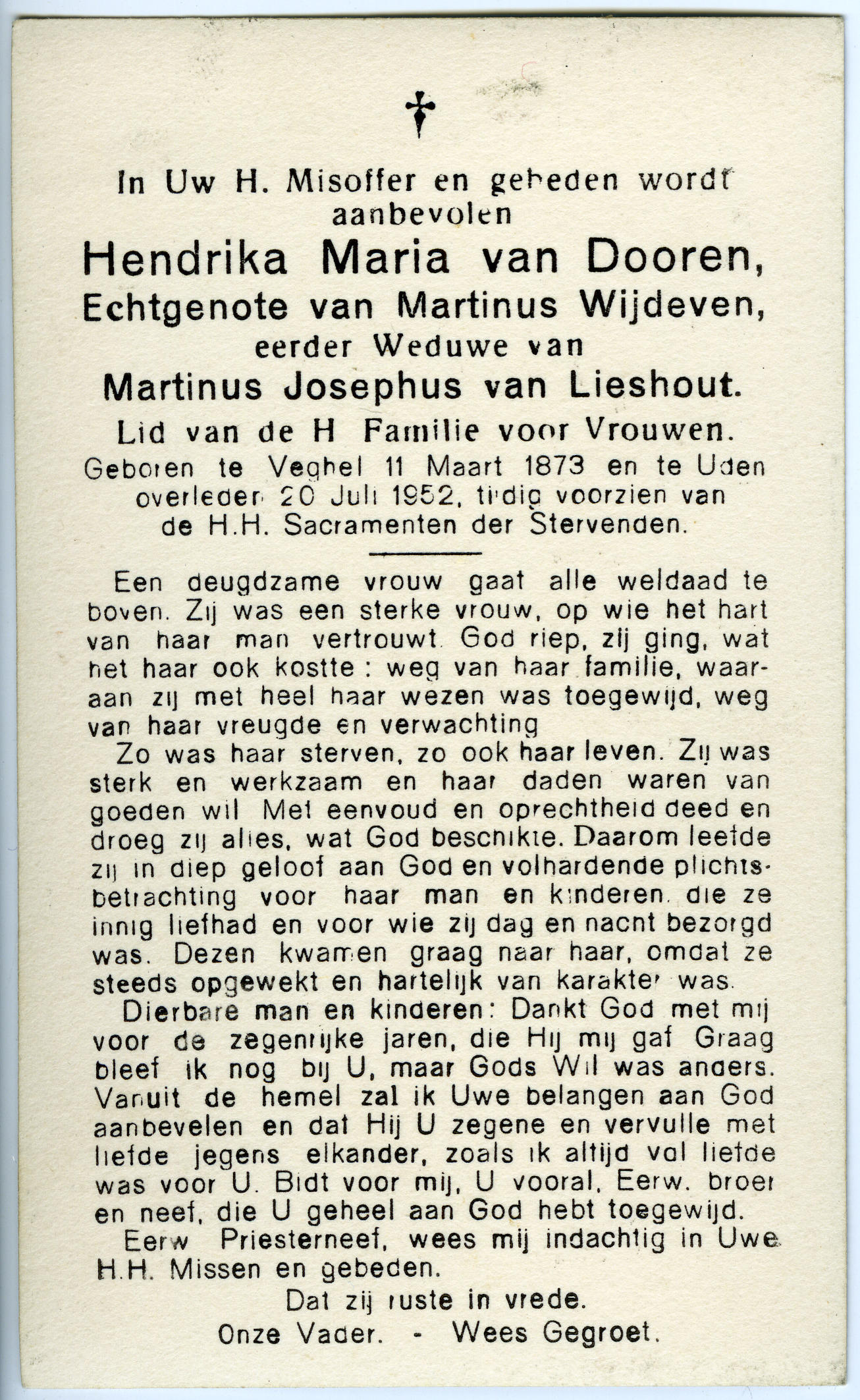 Bidprentje van Hendrika Maria van Dooren, 1952 (bidp...