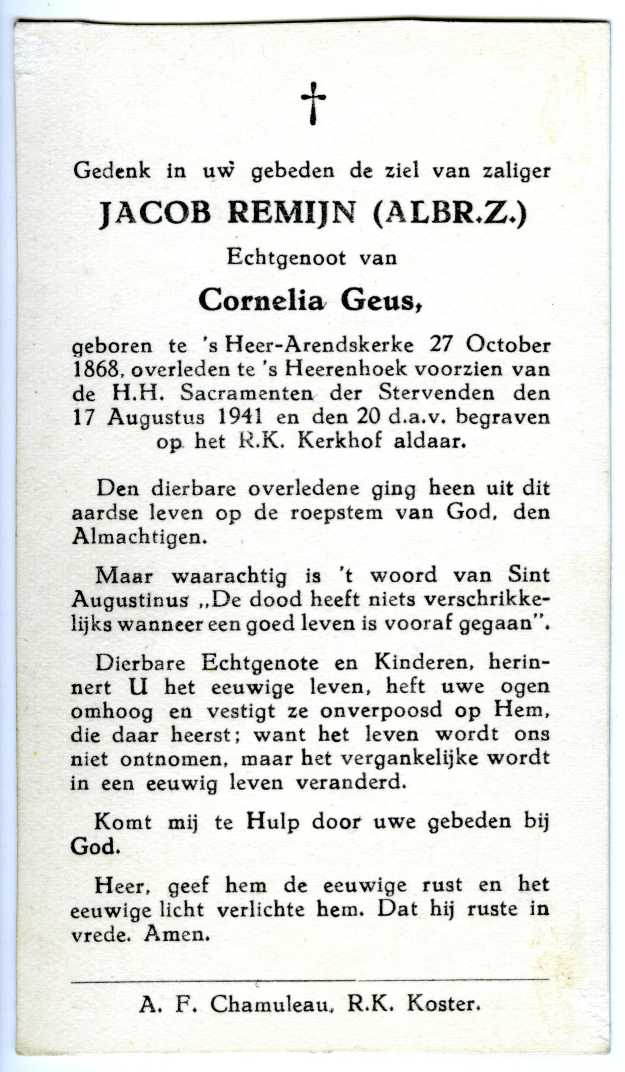 Bidprentje van Jacob Remijn, 1941 (bidprentje)