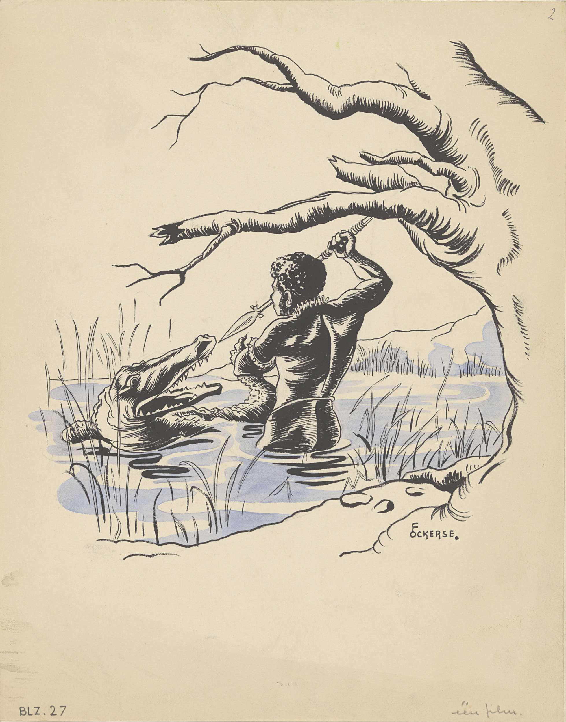 Nieuw-Guineese jager daalt af van een gevlochten ladder