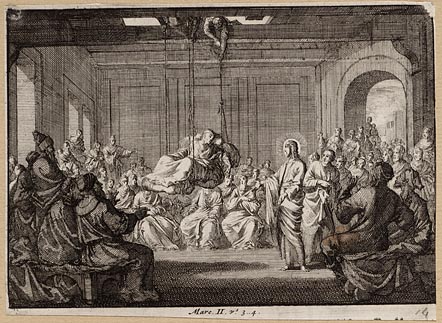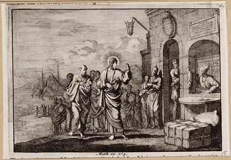 Jezus wenkt Levi bij zijn tolhuis mee te gaan
