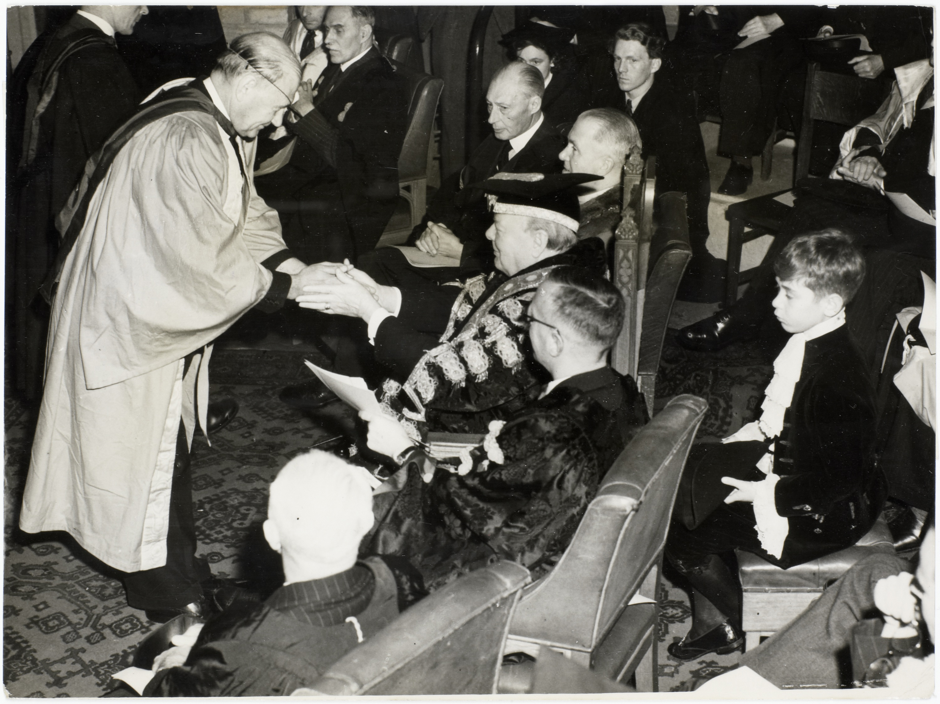 Winston Churchill presenteert eredoctoraat aan Ameri...