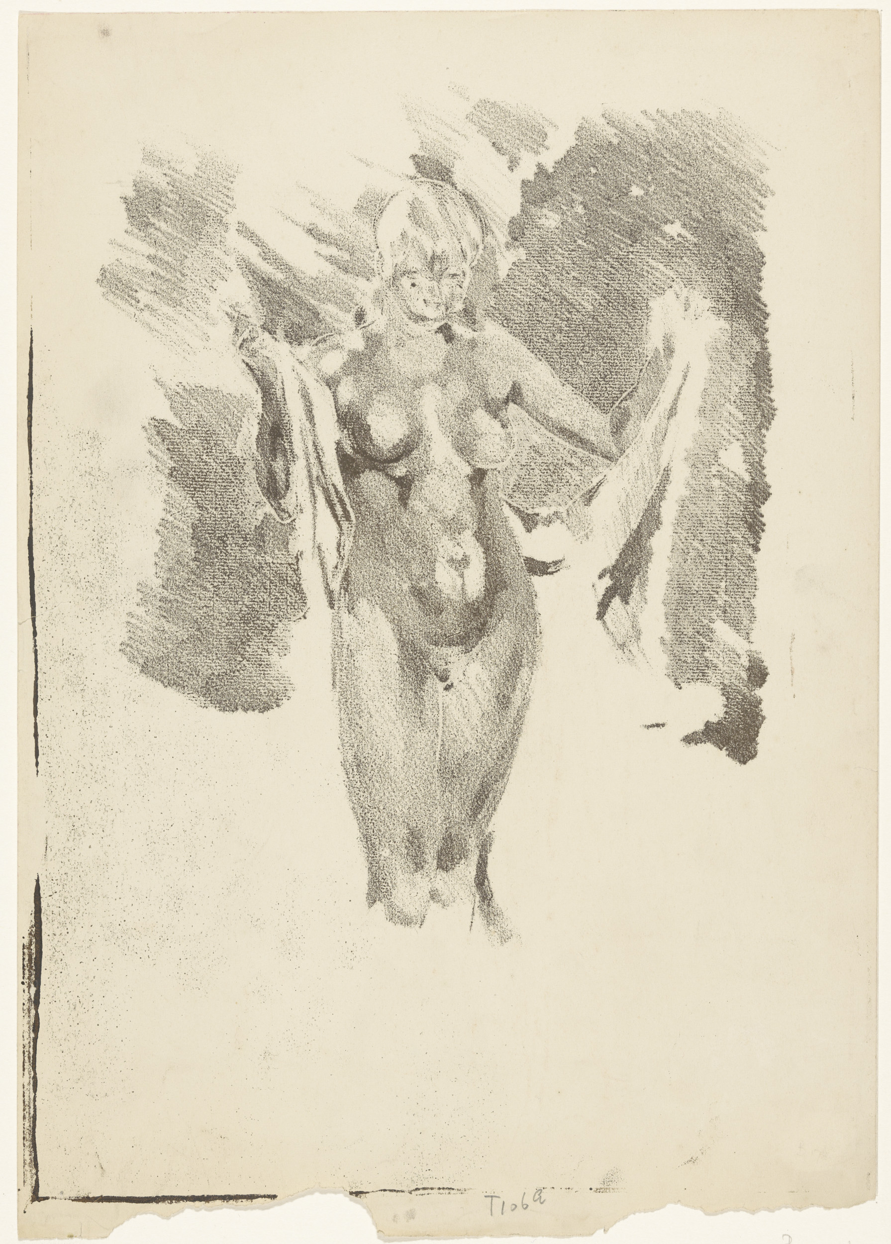 Staande, naakte vrouw die zich afdroogt