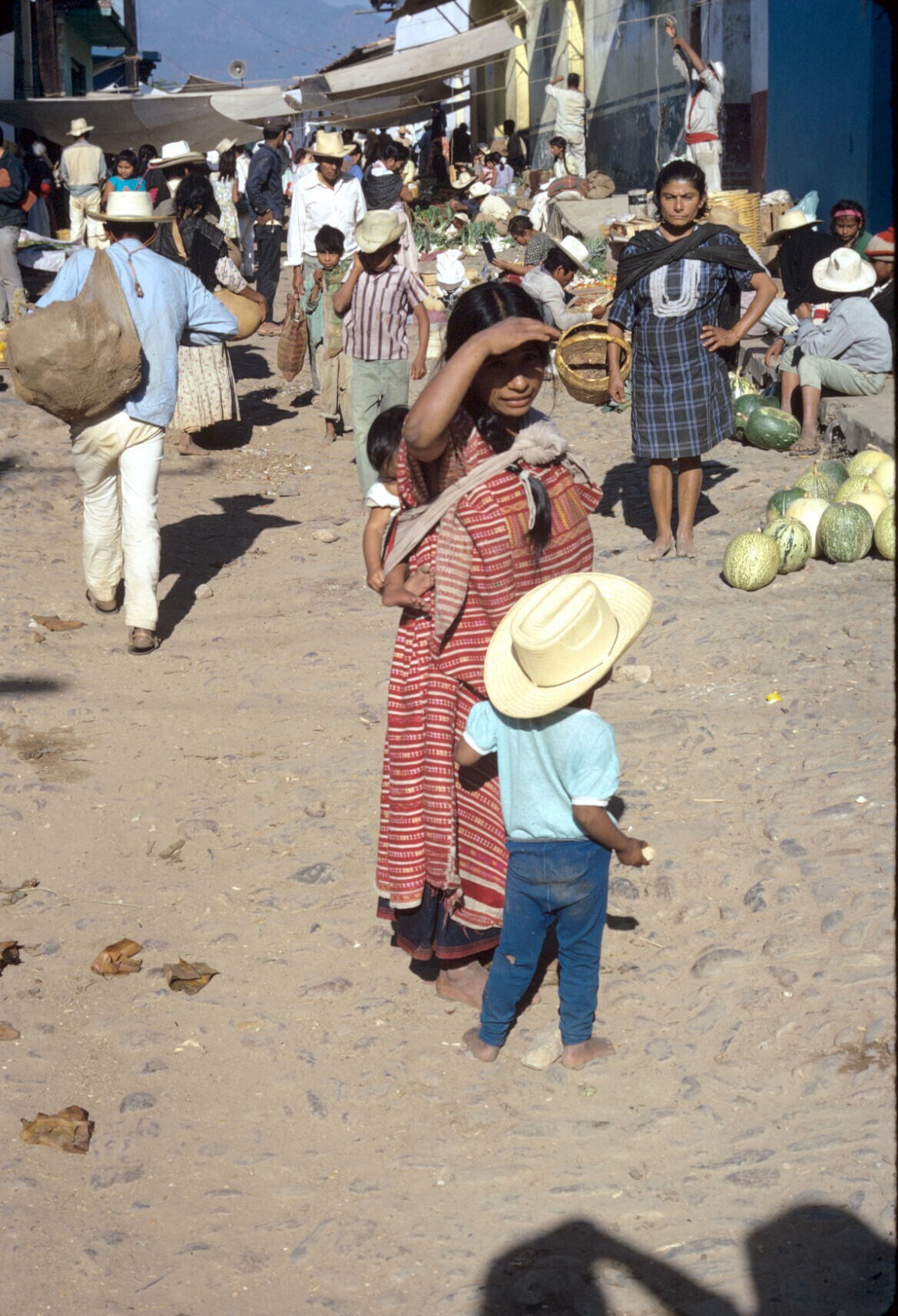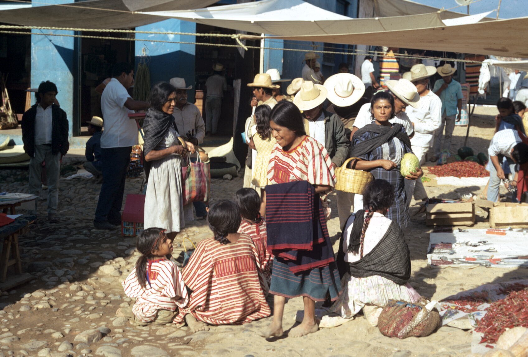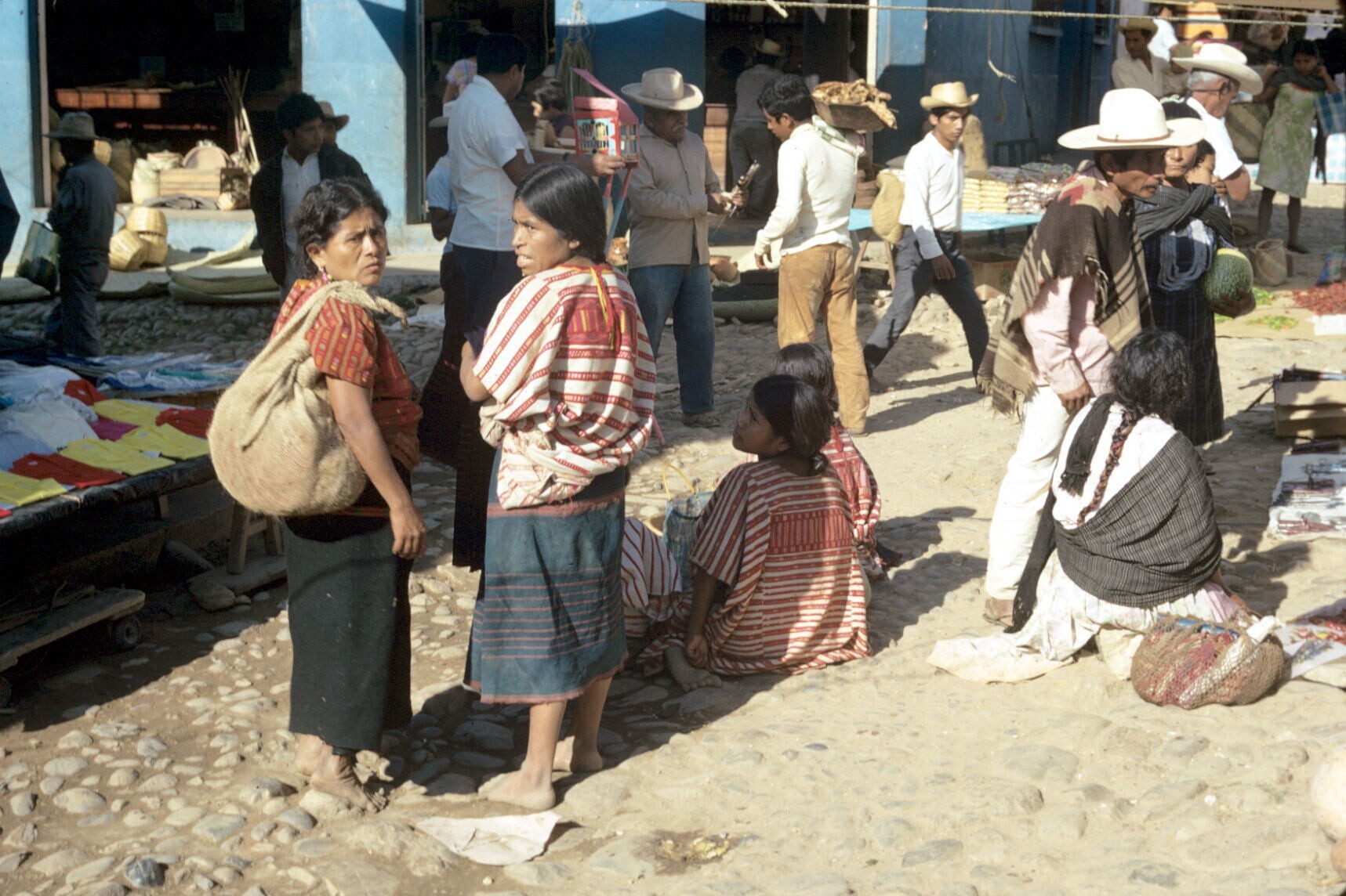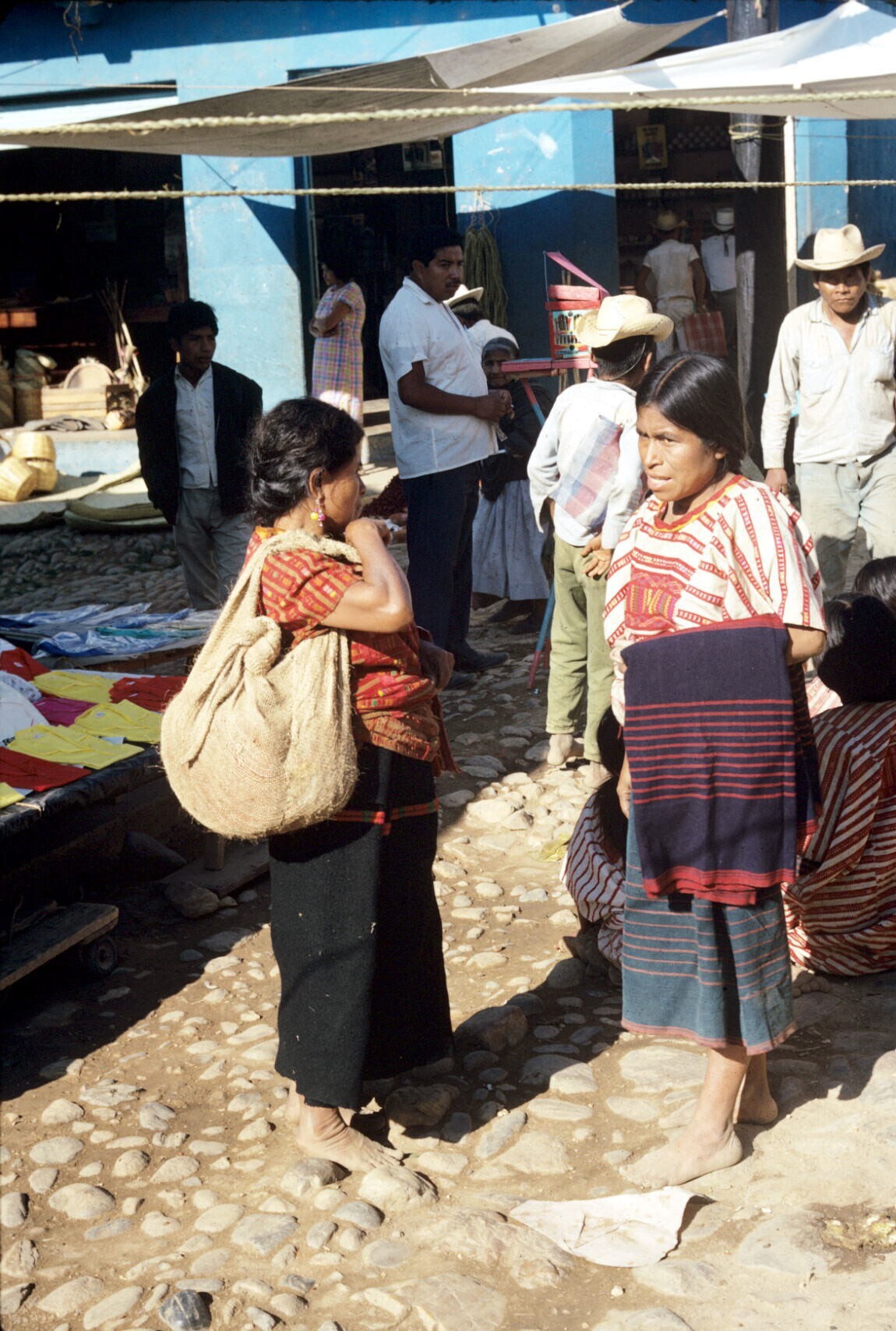 Trique vrouwen op markt, een van hen faja (ceintuur)...