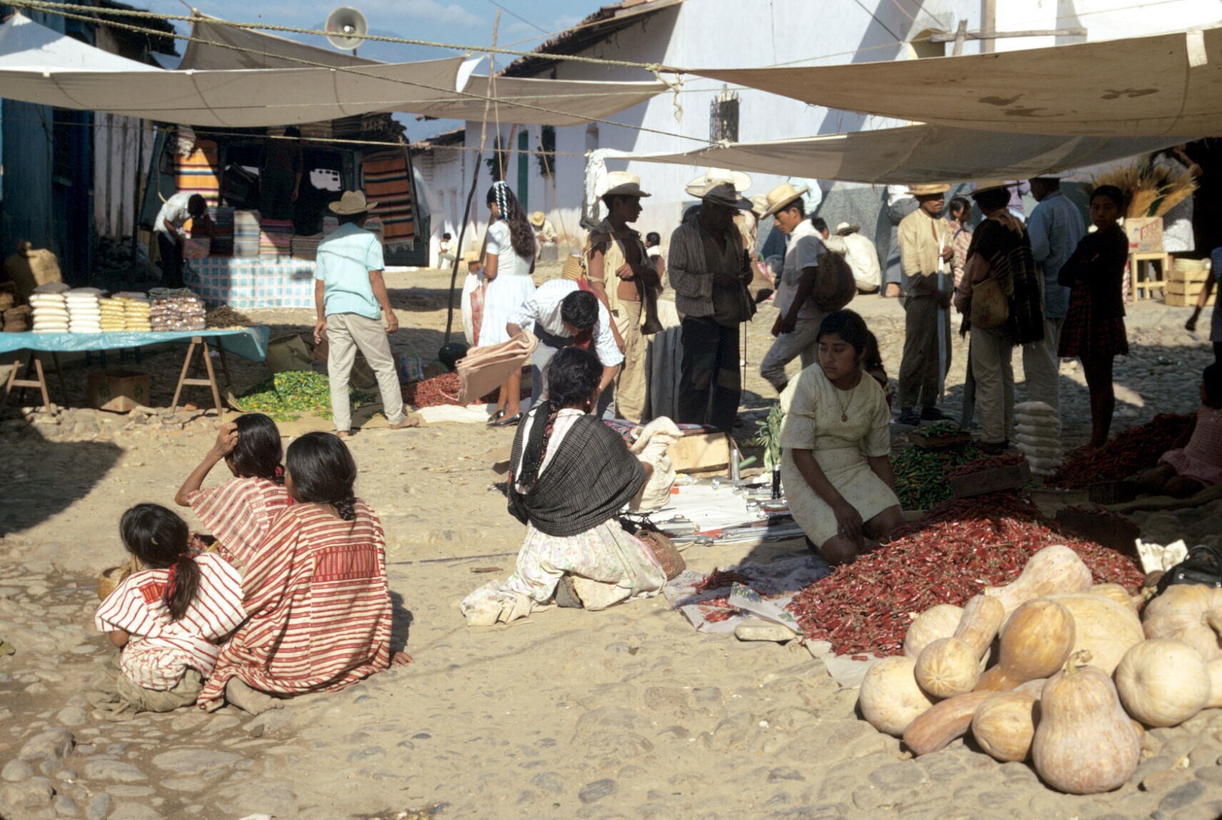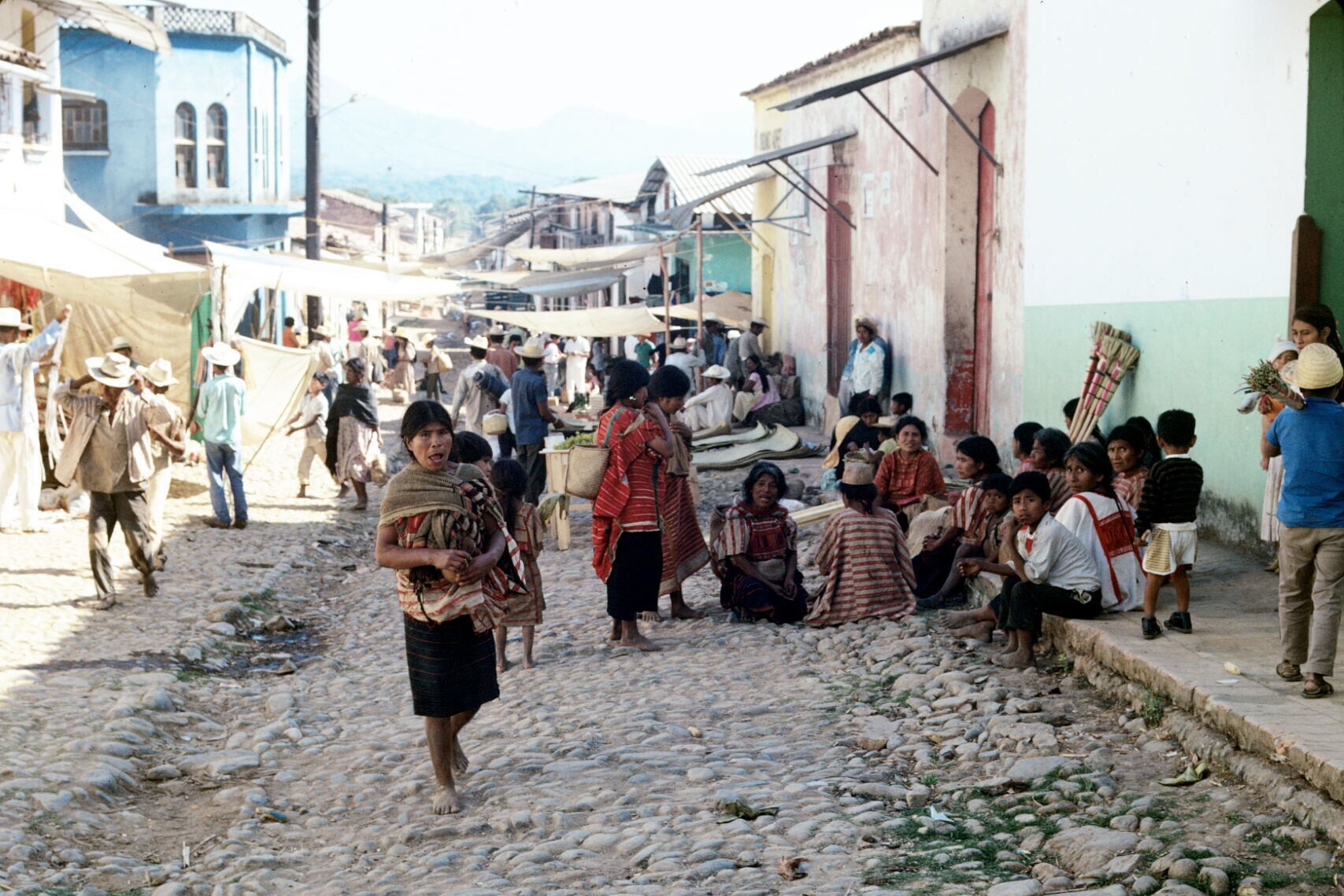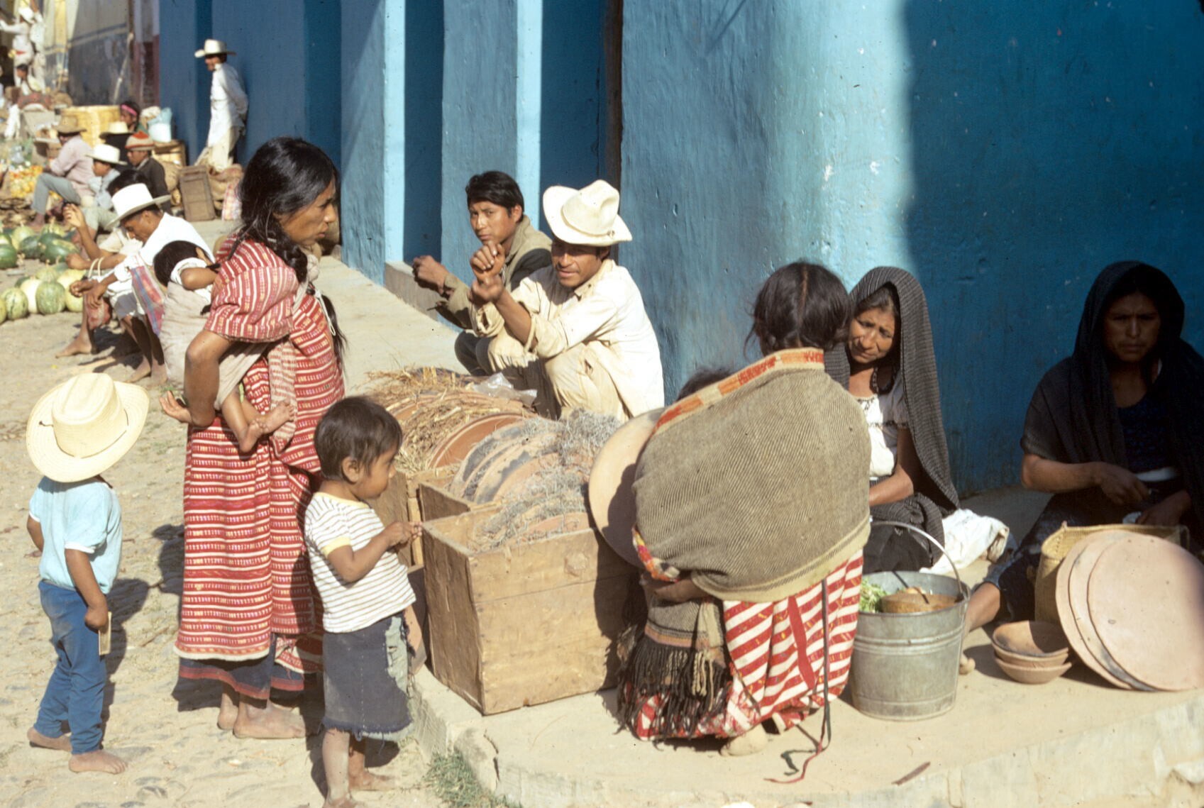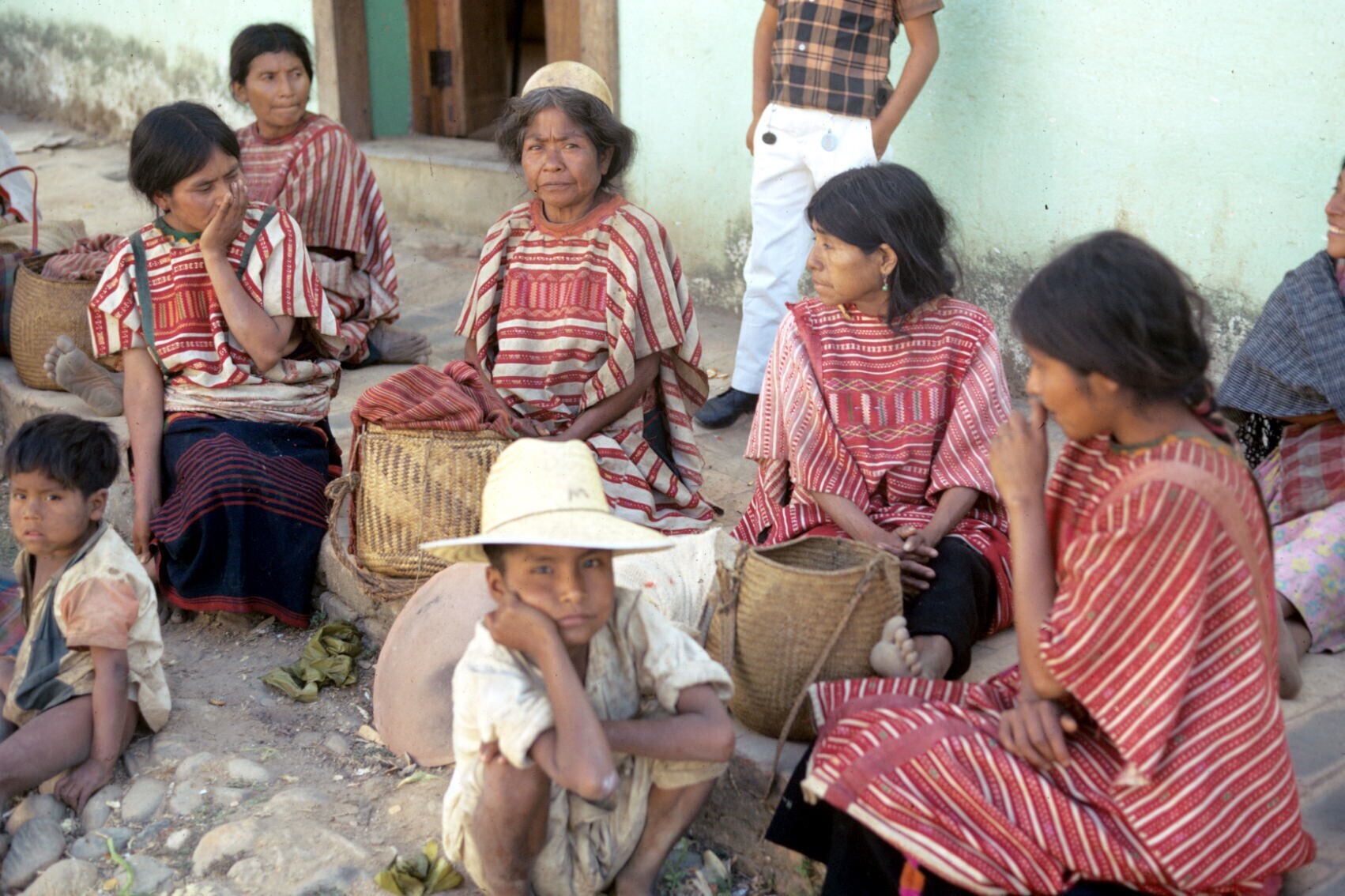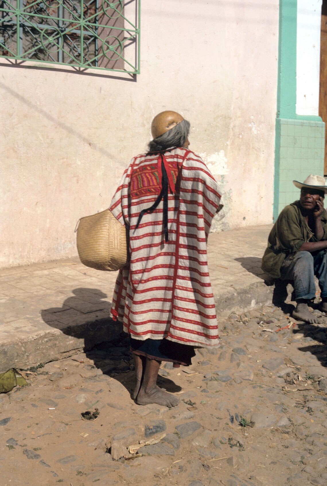 Trique vrouwen op markt, een van hen faja (ceintuur)...