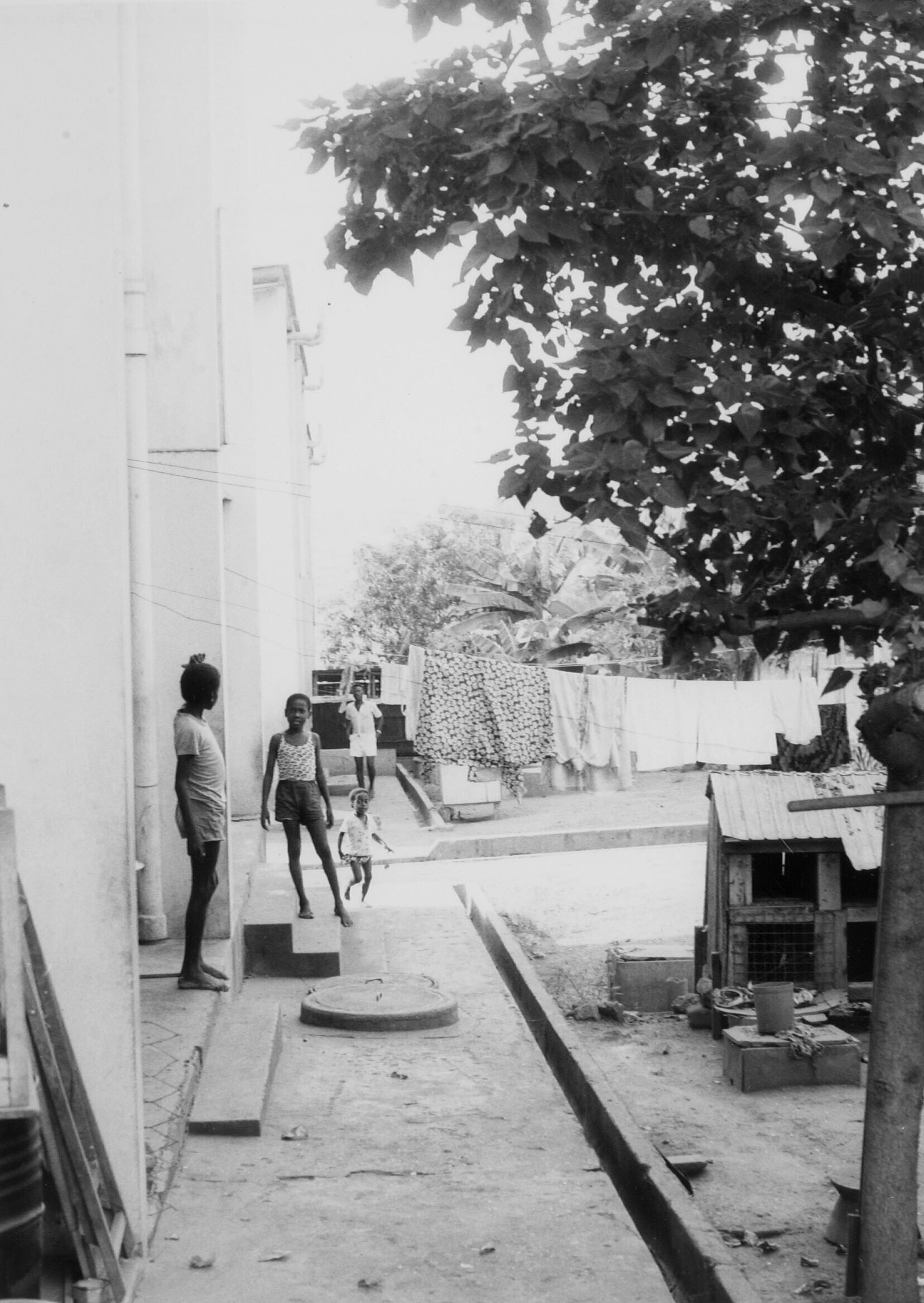 Kinderen op dakterras, waar een wc pot is ingemetsel...