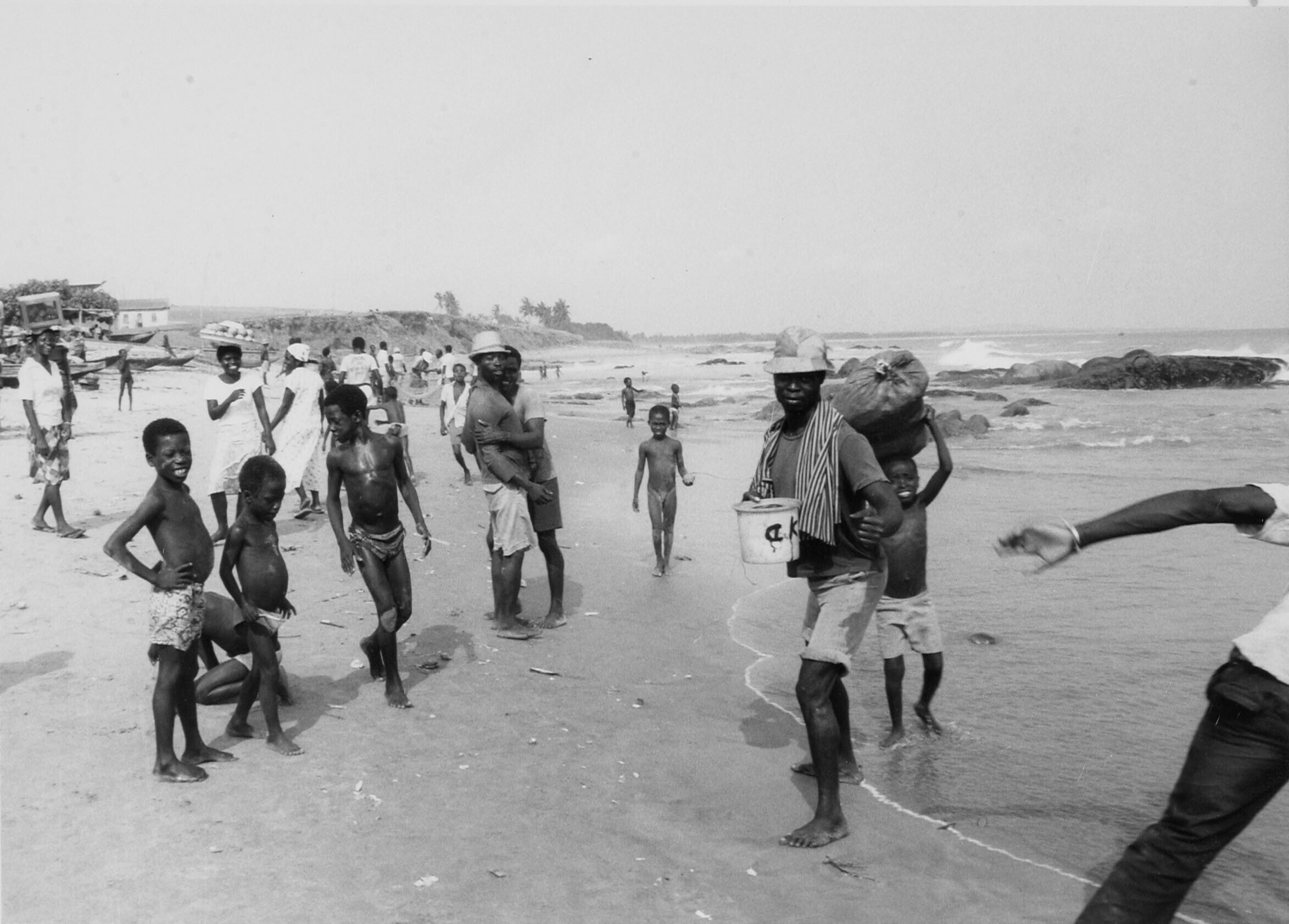 Het strand van Winneba met vissersboten