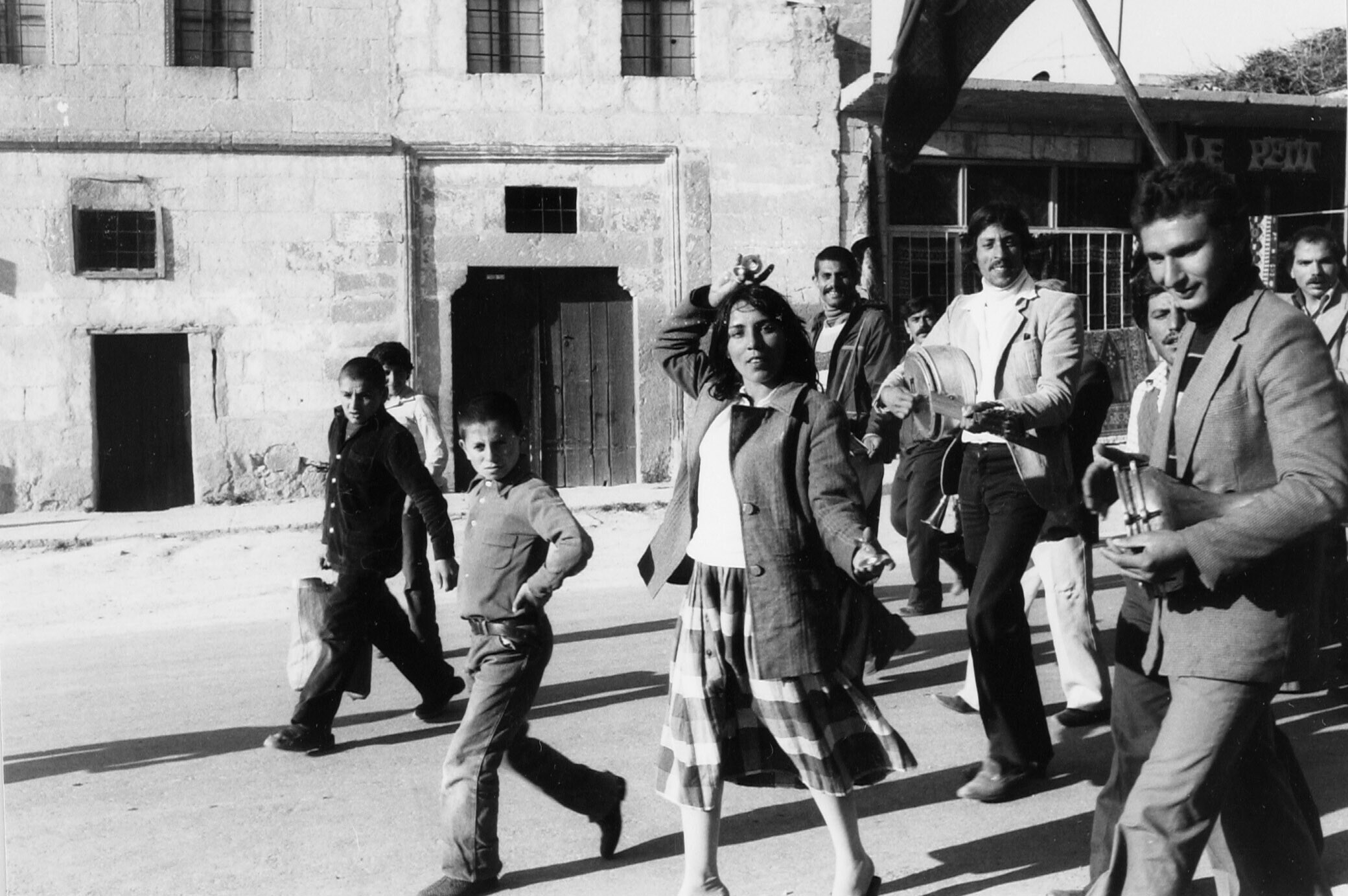Bruiloftstoet met danseres en muzikanten